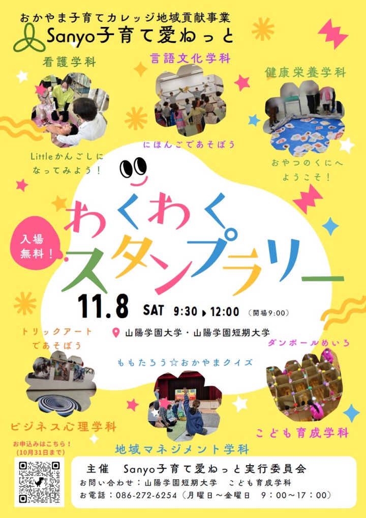 本学では、地域・行政と協働しながら、子育て世代への情報発信や地域の子育てネットワークの場の提供を中心とした子育て支援事業「Sanyo 子育て愛ねっと」を年 3 回開催しています。