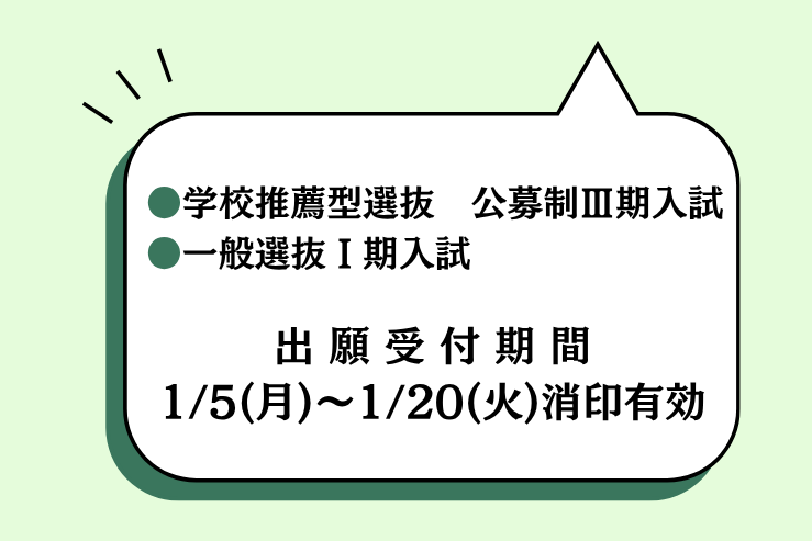 - 一般選抜Ⅰ期入試、学校推薦型選抜(公募制)Ⅲ期入試の出願受付中です。