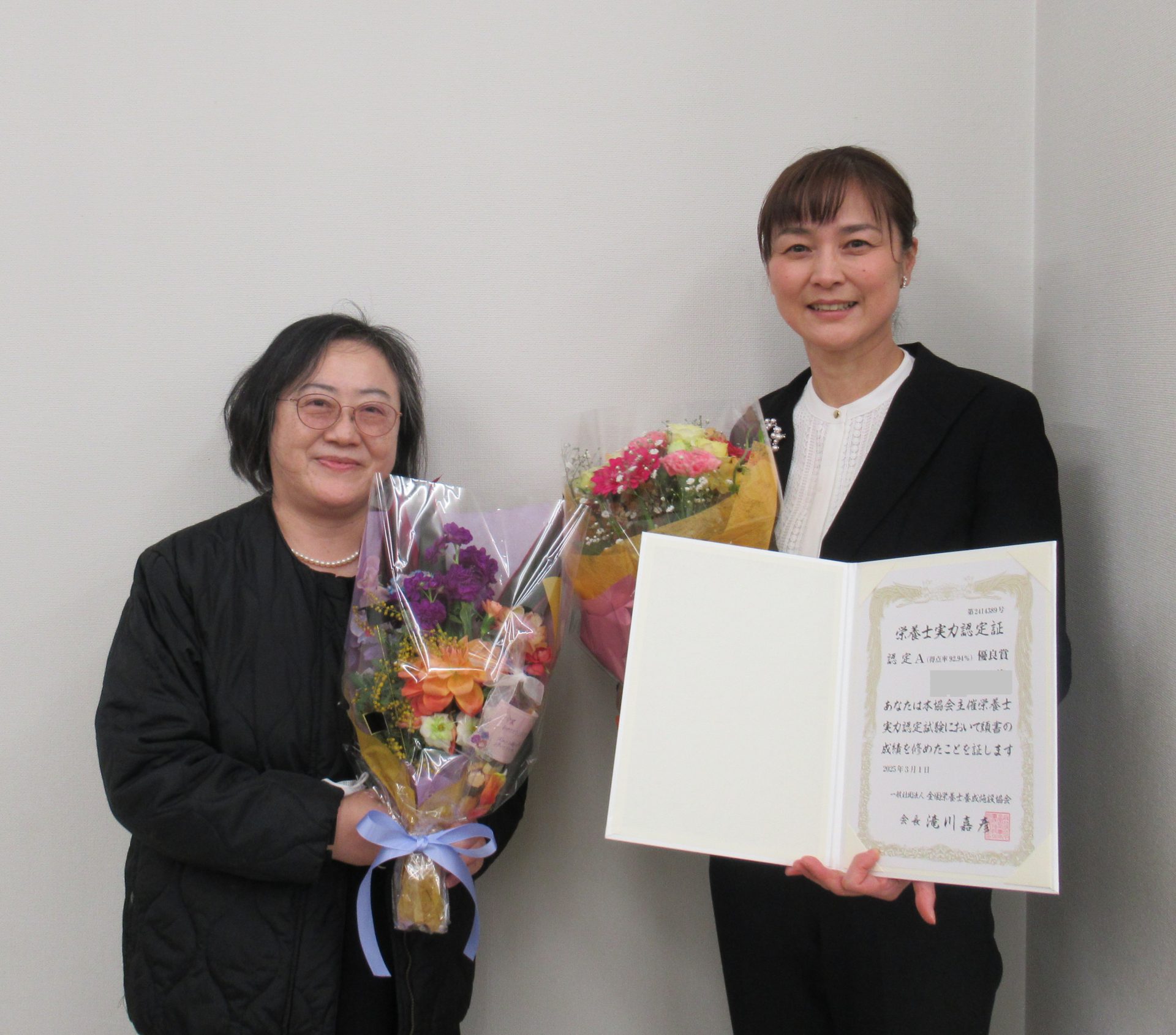 栄養士実力認定試験は、栄養士業務の知識が身についているかをA、B、Cで判定するもので、評価A認定者のうち、得点率90点以上、かつ全体の1%未満を成績優秀者、得点率85点以上、かつ全体の5%(除く優秀者)を成績優良者として表彰状と記念品が授与されます。2024年度は8117名が受験し、その中ですばらしい成績をおさめました。本当におめでとうございます!