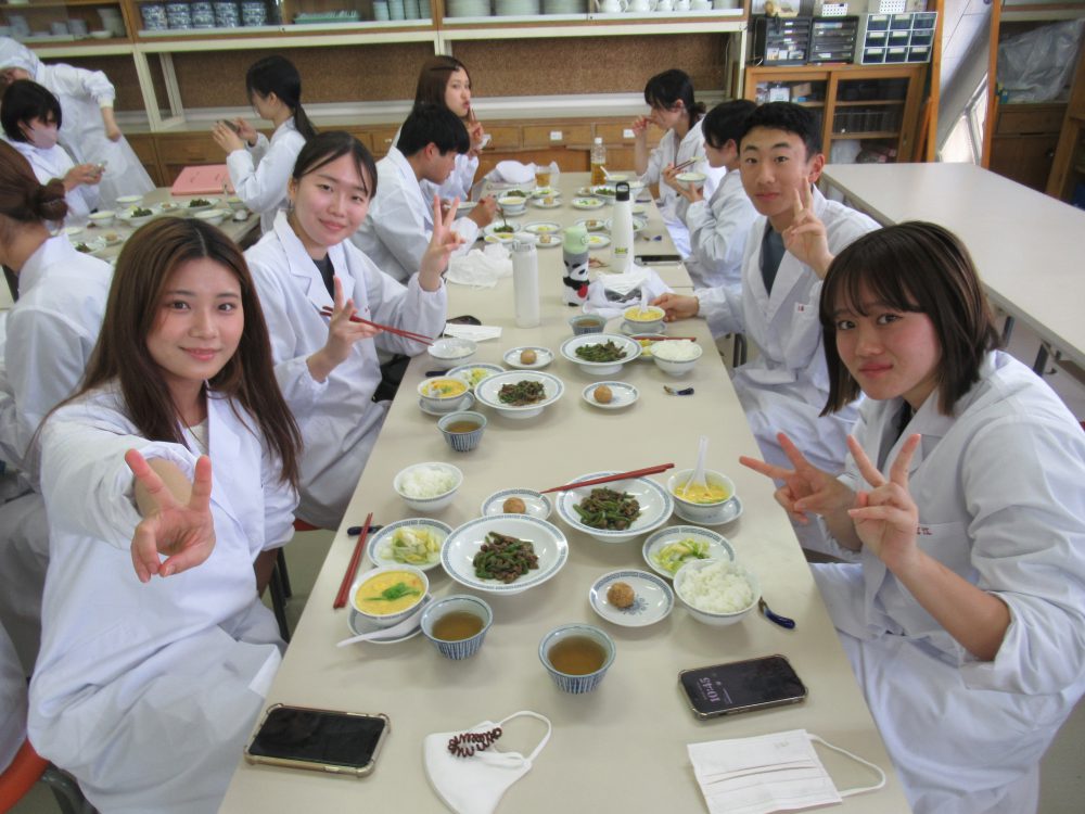 調理学実習では、日本料理・西洋料理・中国料理の調理の基礎を学ぶことで、料理への関心を高め、調理技術や衛生管理の習得を目指します。 米の炊き方、だしの取り方、食材の切り方をはじめとする基本的な調理操作や、食事作法、調理器具の使い方、衛生管理についても学びます。
