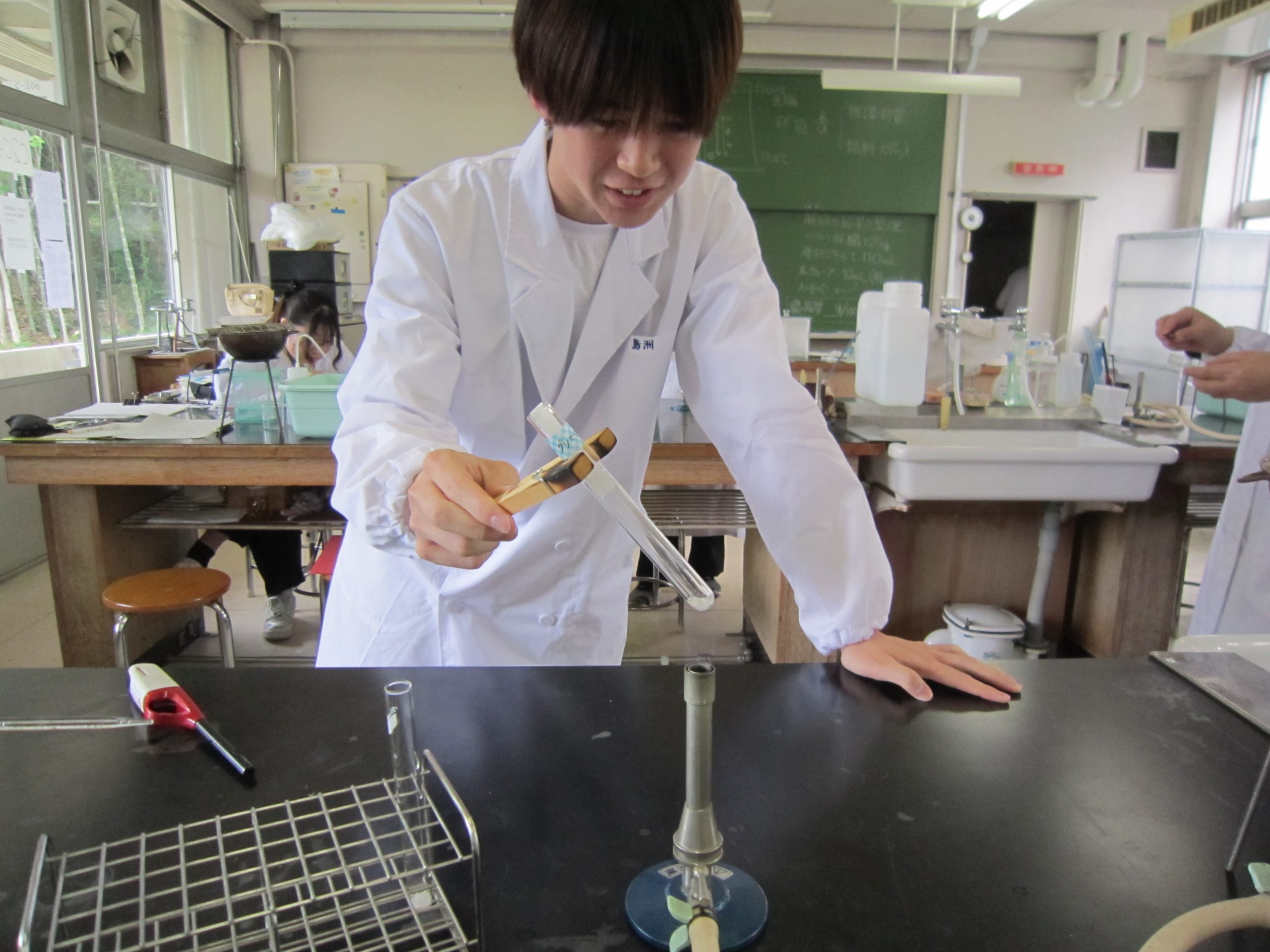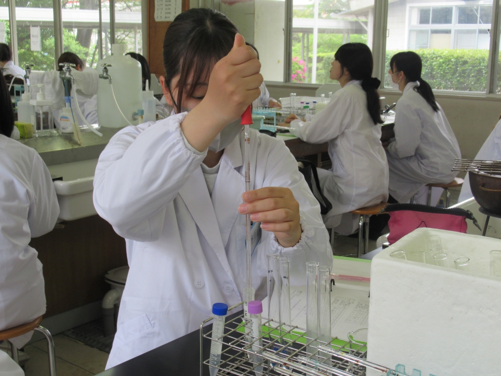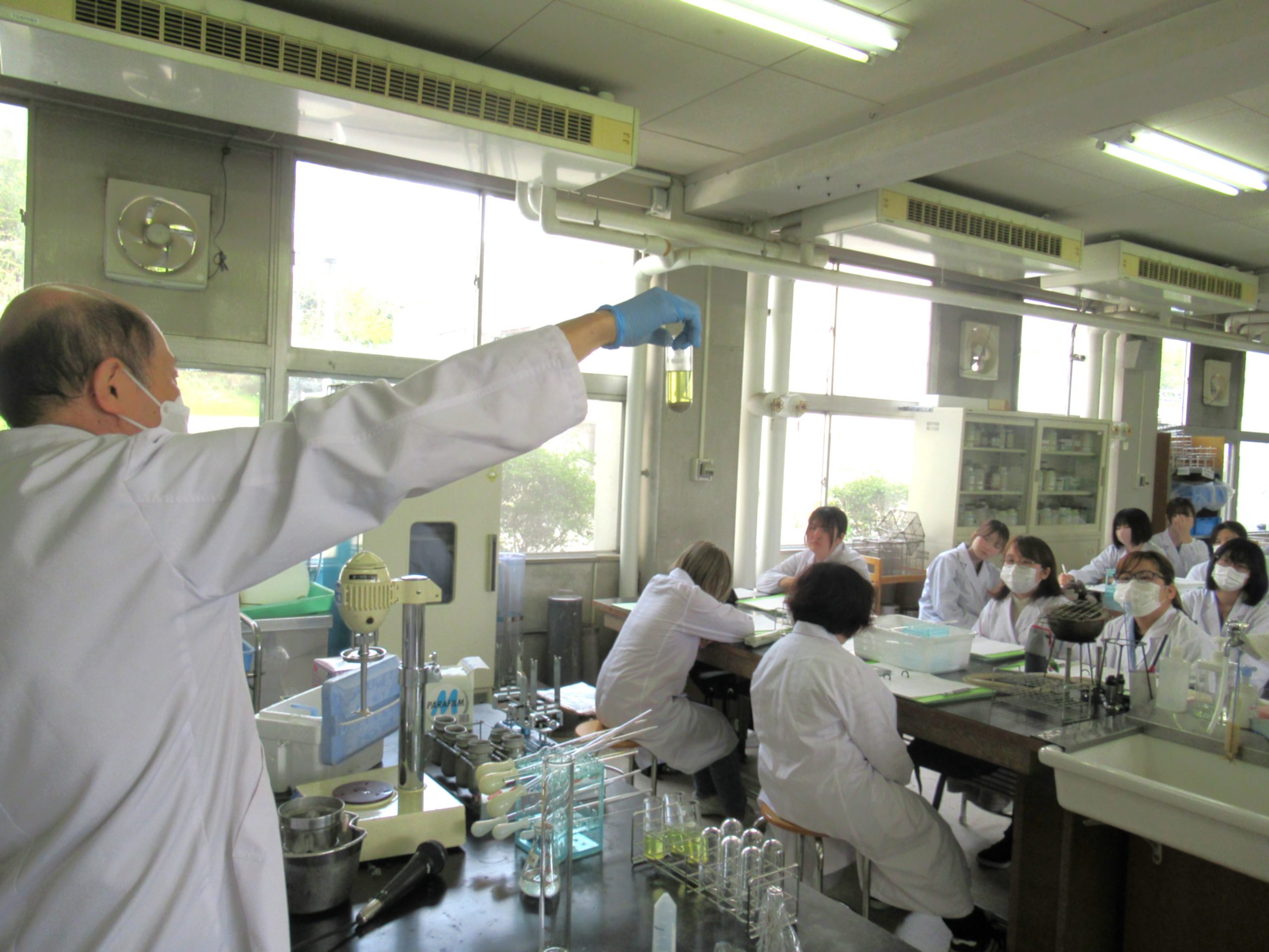2年生で履修する生化学実験の様子をご紹介します。 生化学実験では、栄養素や生体の構成成分の性質、機能について実験を通して学びます。 今回は、牛の肝臓から抽出した脂質成分の分析を行いました。薄層クロマトグラフィーという分析方法を用いて、複数の脂質を視覚的に確認したり、牛肝臓の脂質に試薬を入れ加熱し、変色する様子から構成成分の性質を観察しました。このような様々な方法で、脂質についての理解を深めました。