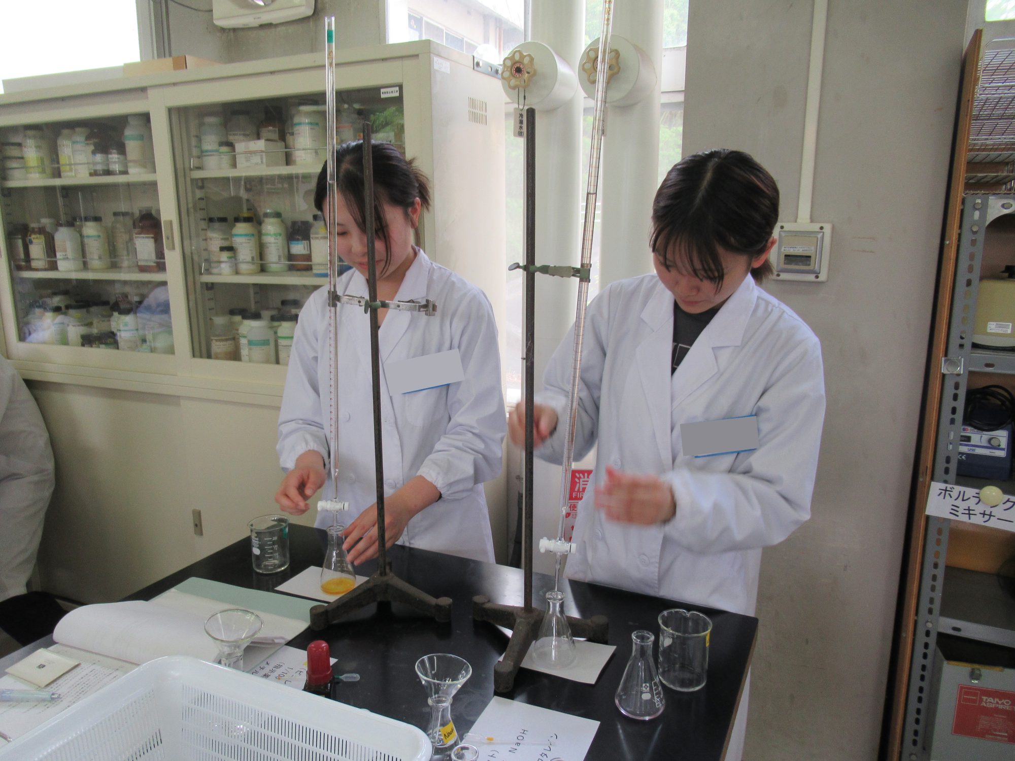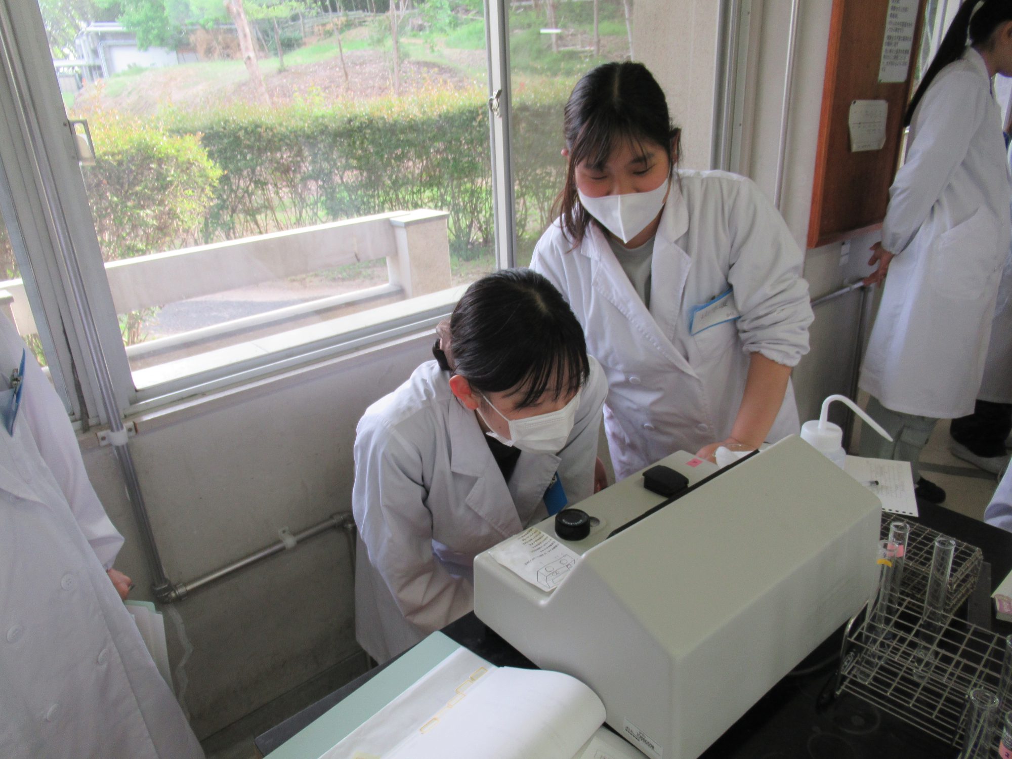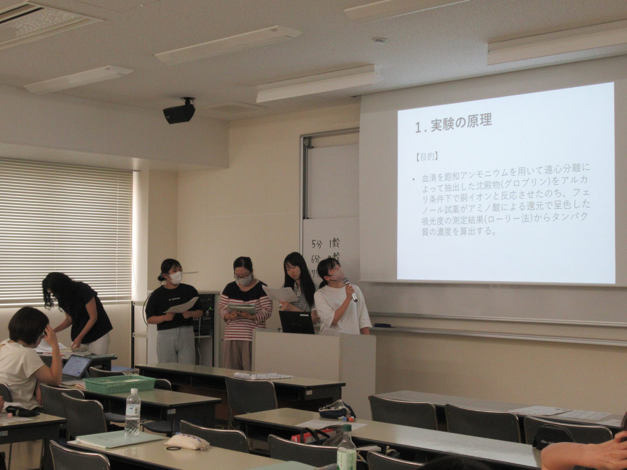 栄養生理学実験の様子をご紹介します。 栄養生理学実験では、唾液、血液、尿成分などの実験を行い、成分の生理学的意味や栄養摂取との関連について考察したり、各種身体機能の測定や安静時代謝量の測定を行ったりして、体の仕組みについて学びます。 最後の授業では、これまでの実験テーマについて各班が発表を行い、学びを深めることができました。