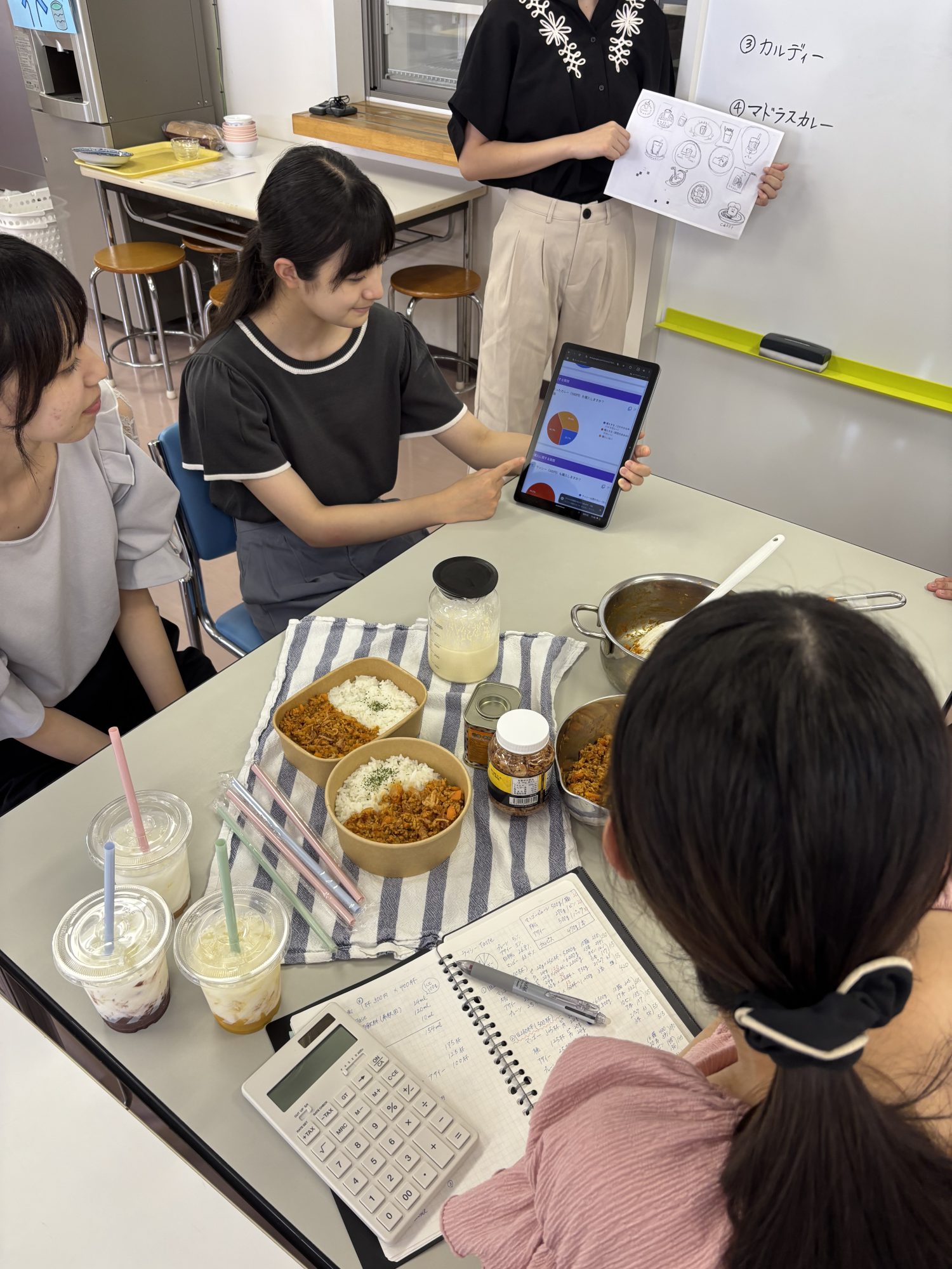 健康栄養学科では、2026年度入学生より「フードビジネスコース」が始まります。 そこで、現在の2年が大学祭での販売を目指し、スパイスカレーやラッシーの開発に挑戦中です。 これまで学んだ調理技術や衛生管理の知識を実践で活かすとともに、ビジネス面ではマーケティング調査や販売計画を進行中。 価格設定やパッケージデザイン、メニュー名の考案など、企画から販売までを取り組んでいます。10/25(土)と26(日)の大学祭で出店予定です。ぜひ食べにお越しください!