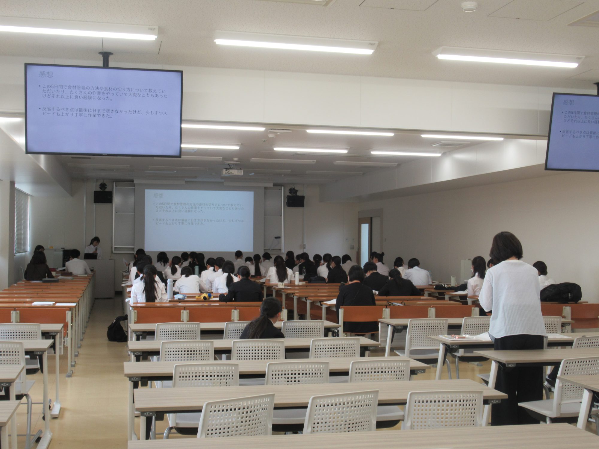給食校外実習では、前期に学内の授業で実施した大量調理の経験をもとに、より専門的な知識や技術を学ぶため、学校や病院、福祉施設などの実際の現場で実習させていただきます。報告会では実習内容を発表し、他の実習先での取り組みを聞き、質疑応答をすることで、実際の給食現場を知る貴重な学びとなりました。