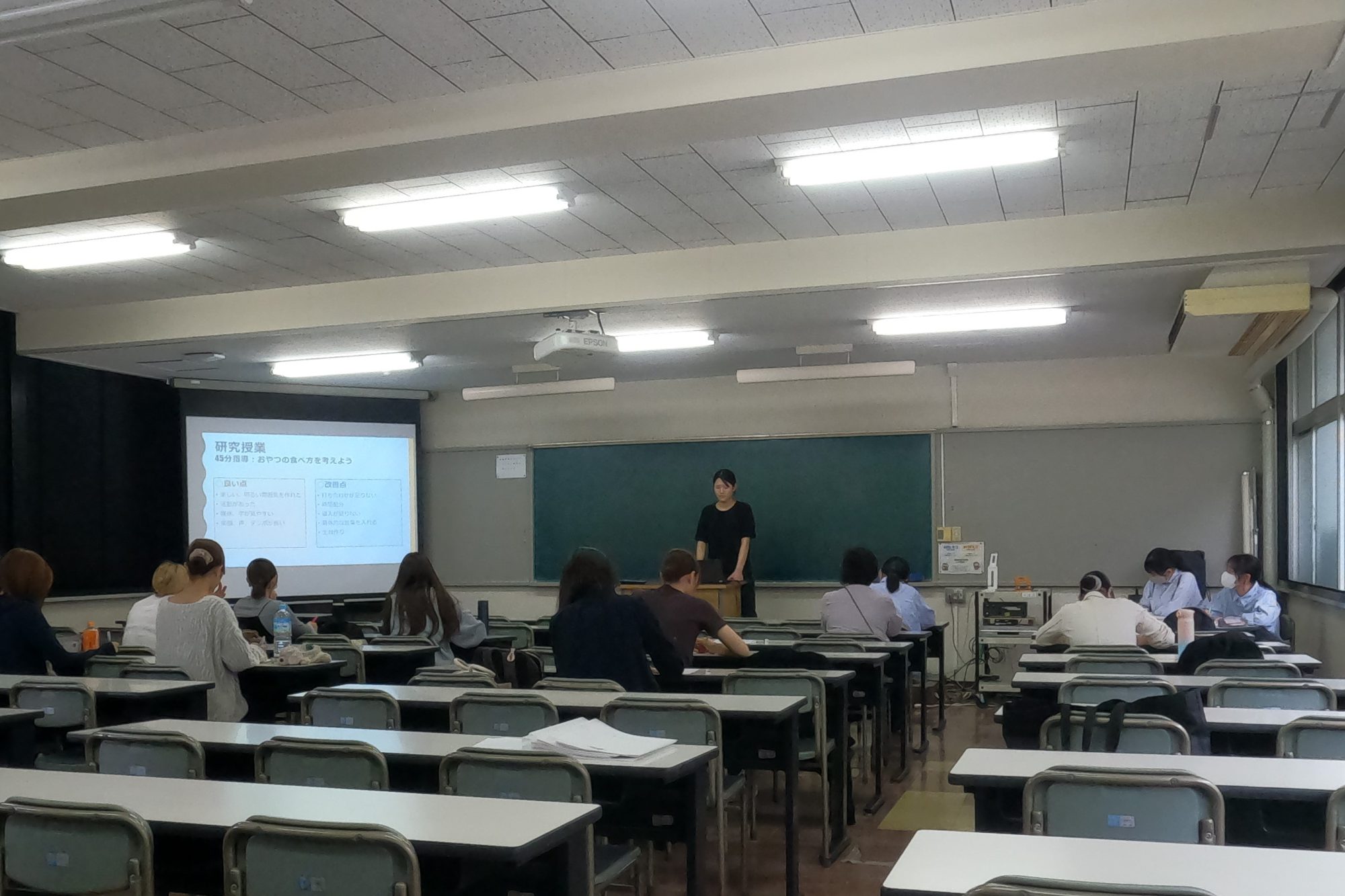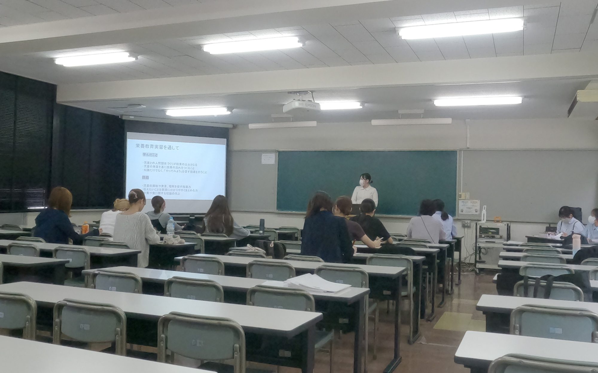 2年の栄養教諭・学外実習報告会の様子をご紹介します。 教職課程を履修している2年7名が、無事に5日間の教育実習を終えました。 教職課程履修者の1年や教員に向けて、実習を通して学んだことや研究授業について報告しました。質疑応答も活発に行われ、教育実習を来年に控える1年にとって、とても良い学びとなりました。実習を終えた学生達も、改めて自身の教育実習を振り返ることができ、栄養教諭についての理解がいっそう深まりました。
