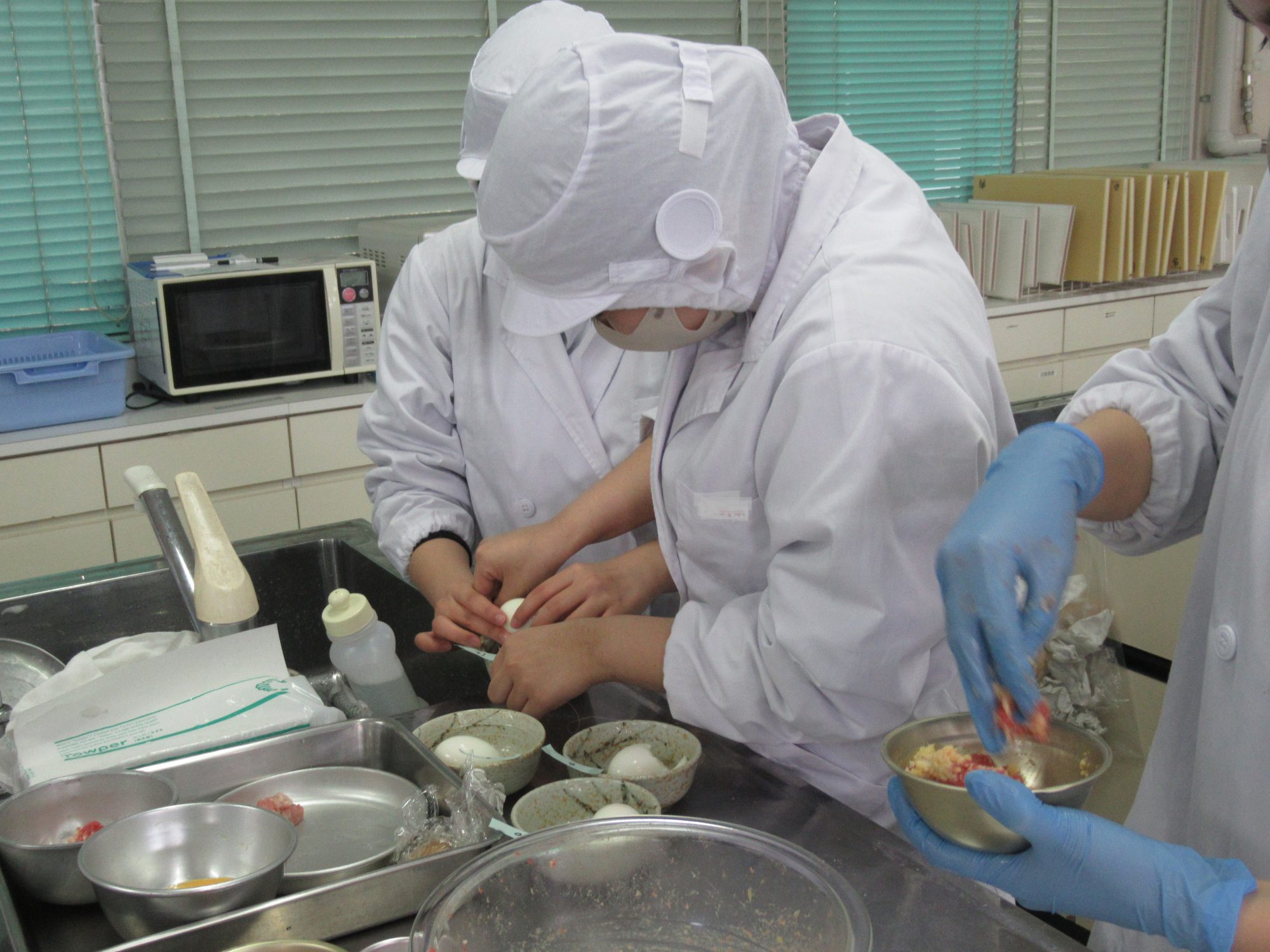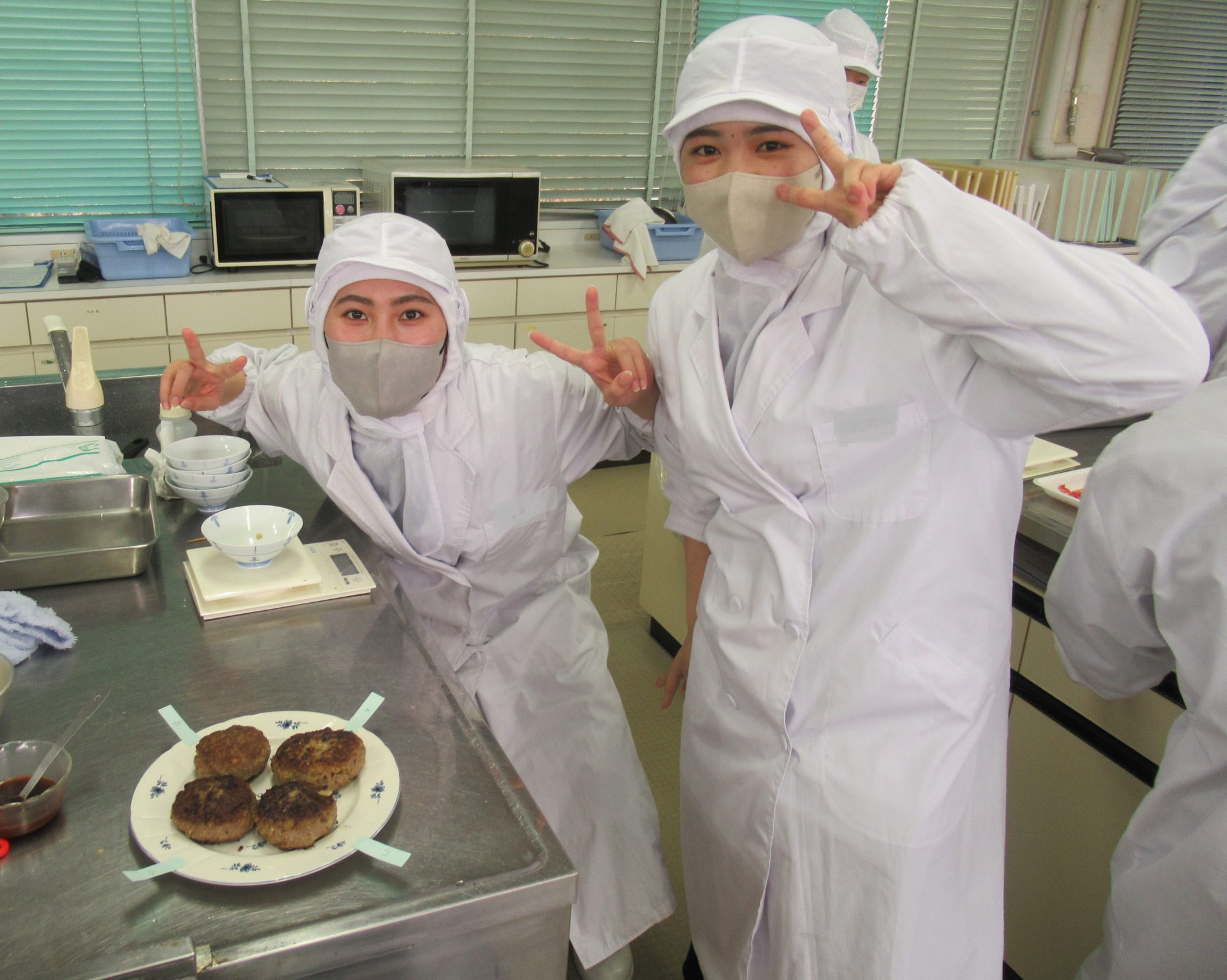 後期の調理学実験についてご紹介します。調理学実験では、調理に関する基礎的実験を通して科学的な視点でとらえる能力を養い、調理学の知識を深め、さらに食品の加工による成分の変化を学びます。 今回の実験では、動物性食品の調理を行いました。たんぱく質分解酵素による肉の軟化効果・ハンバーグの副材料による比較・卵の加熱条件による凝固の実験を通して、動物の筋繊維の特徴や加熱条件などを理解し、それをうまく応用し調理する技術を学びました。