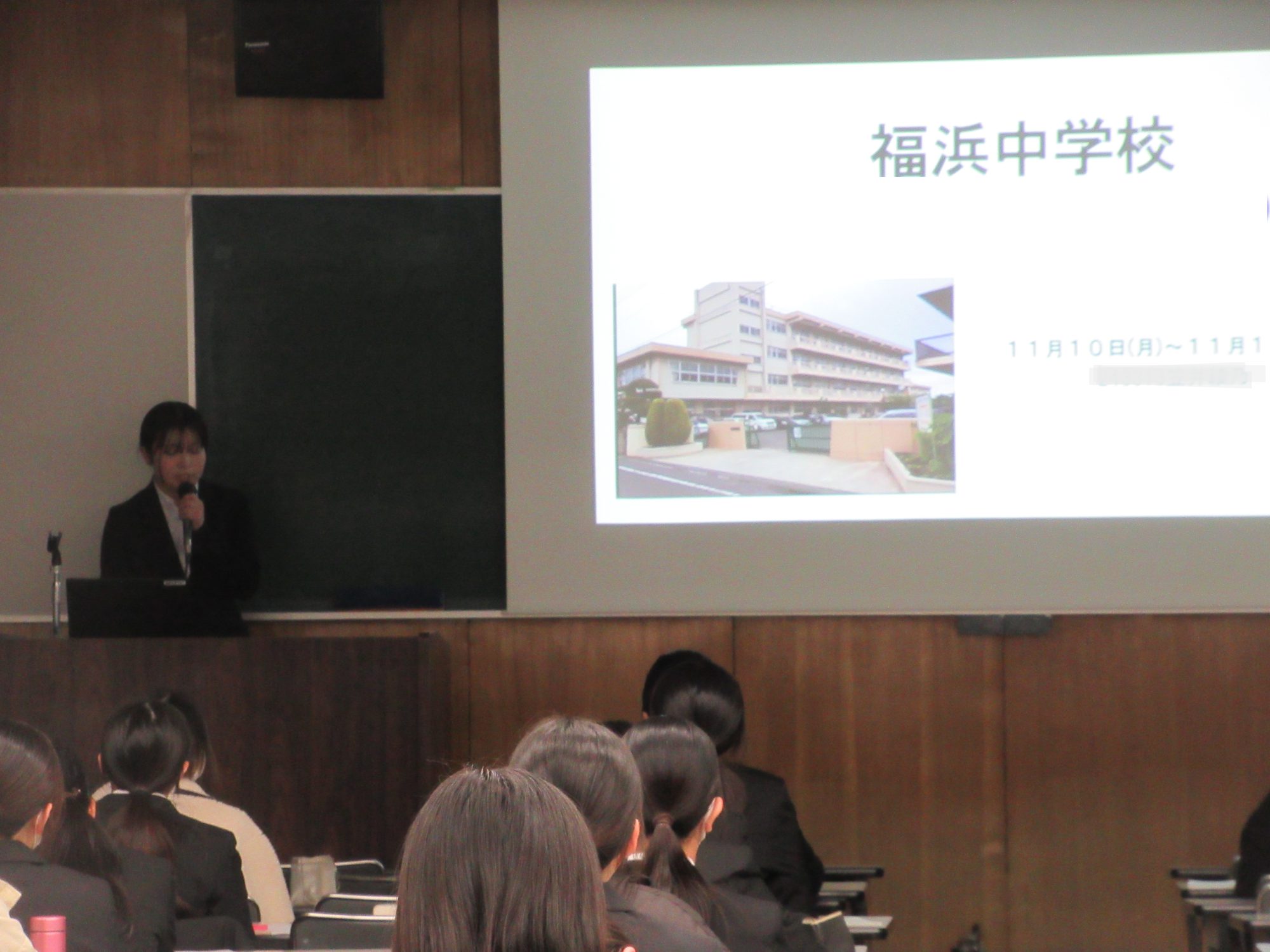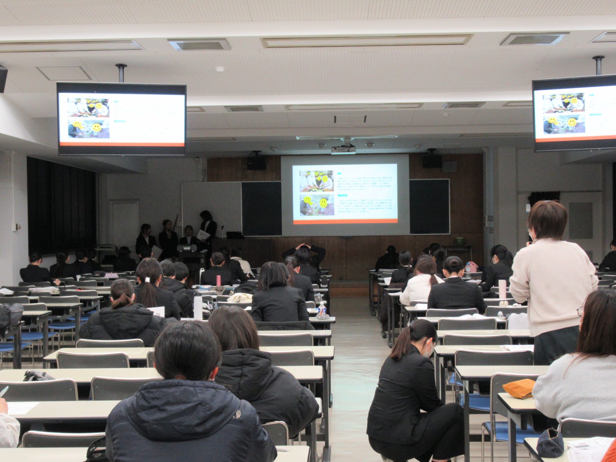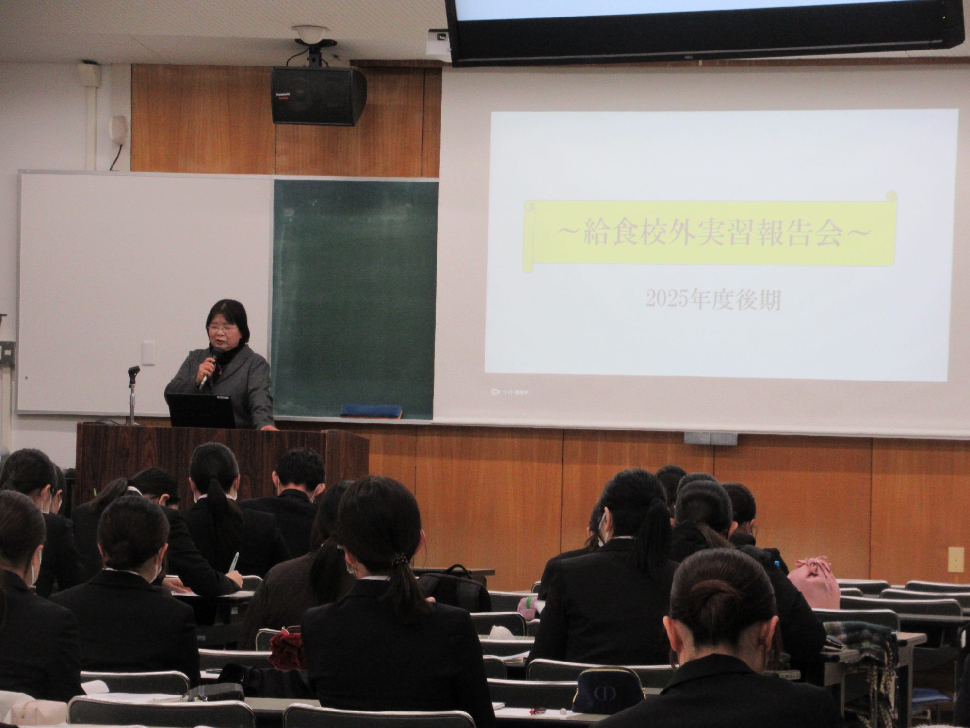 健康栄養学科2年の学生が、11月に実施した給食校外実習の報告会を行いました。 病院や高齢者福祉施設、学校、保育園、事業所等で実習に取り組み、それぞれの施設での学びの発表や後輩へのアドバイスを行いました。学生や先生方からの発表内容についての質問にもしっかりと回答し、栄養士としての学びをさらに深める会になりました。