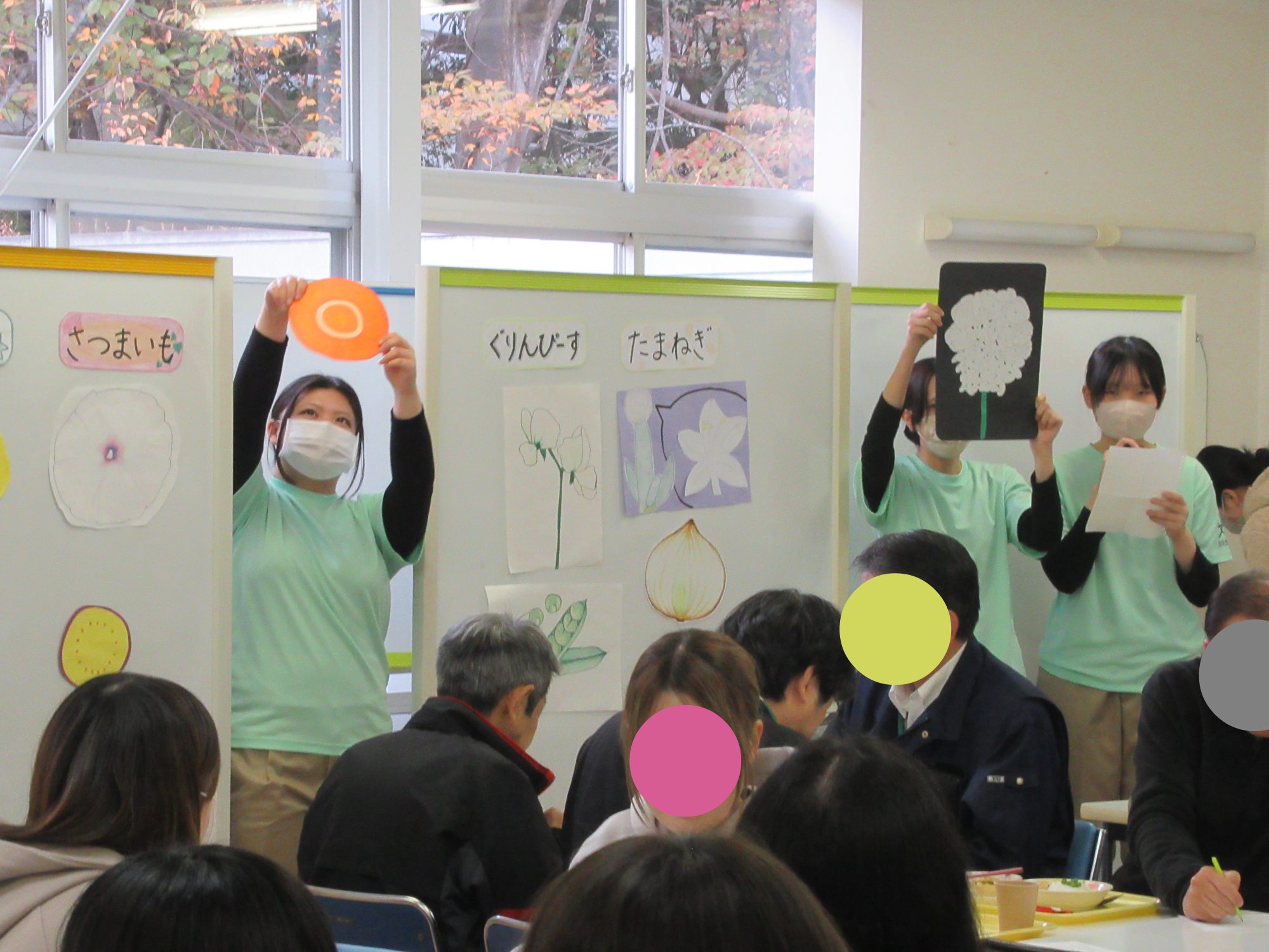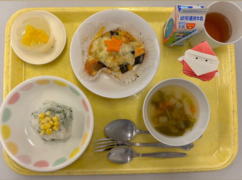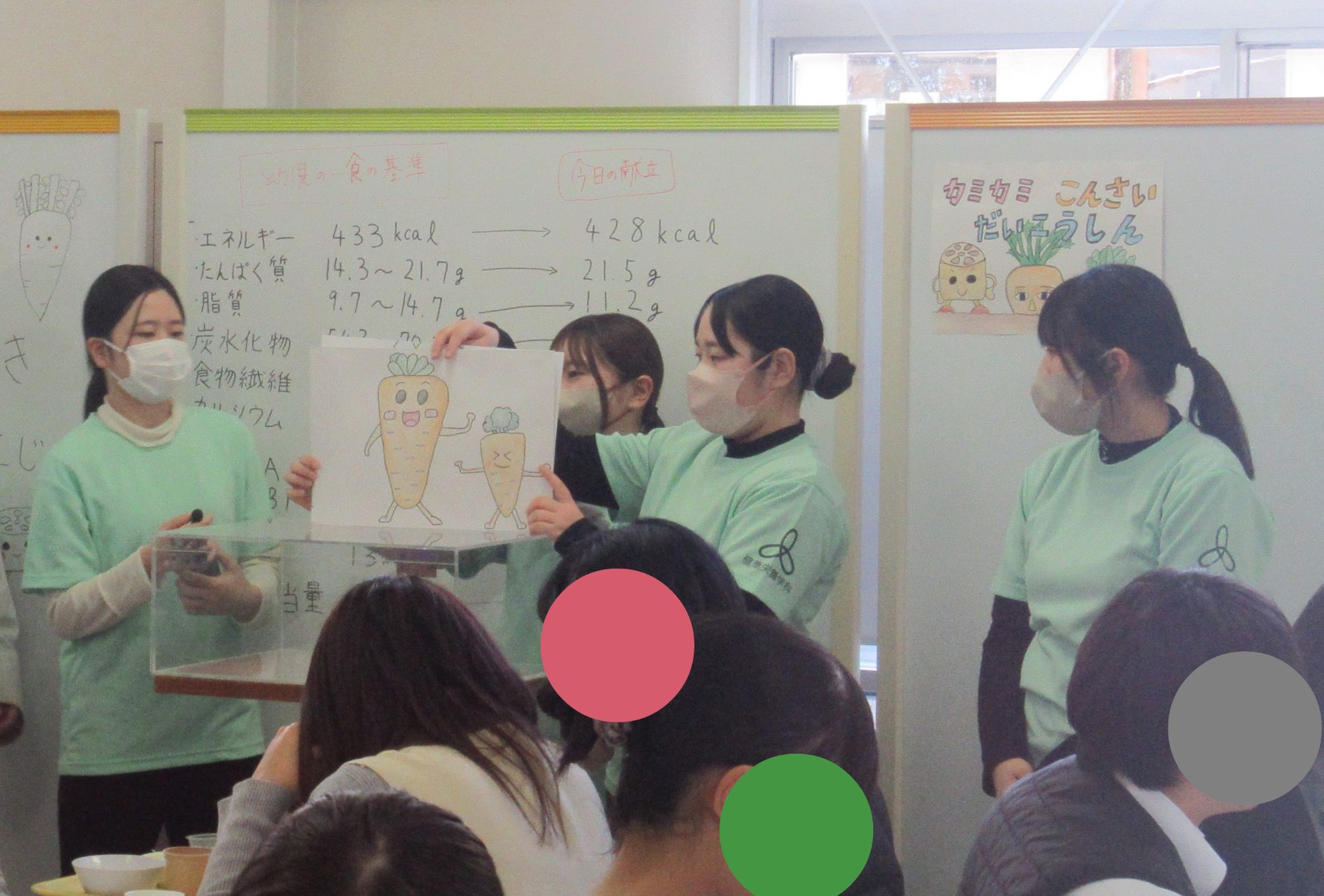 給食管理実習Ⅱで2年の学生が幼稚園給食を100食調理し、学生・教職員に提供しました。幼稚園児向けの食育発表も行い、園児に食に関する興味を持ってもらい、食の魅力を効果的に伝える方法をグループで検討し、クイズ・紙芝居・ペープサートを作成し実施することができました。給食も食育発表も学生・教職員の方々に好評で、学生にとって良い学びとなりました。