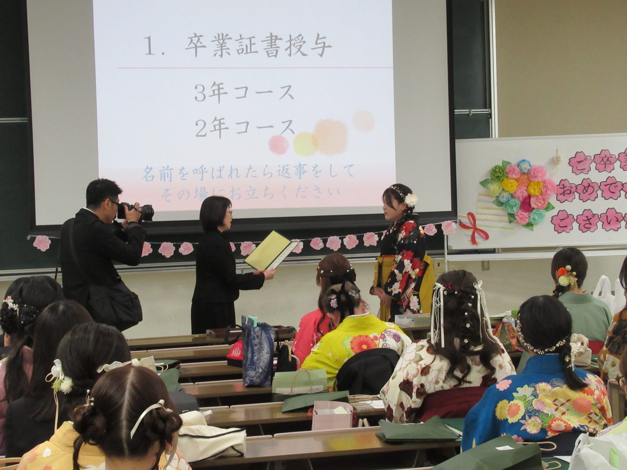 3月15日に、卒業証書・学位記授与式が行われました。式後の学科の集いでは、クラス顧問による呼名、学科長による卒業証書の授与が行われました。 また、シャロム会(謝恩会)では、大学生活を共にした仲間や教員と和やかな時間を過ごしました。 4月からはそれぞれ新しい道を歩みますが、教員一同、皆さんの門出を祝福し、今後のご活躍をお祈りしています。