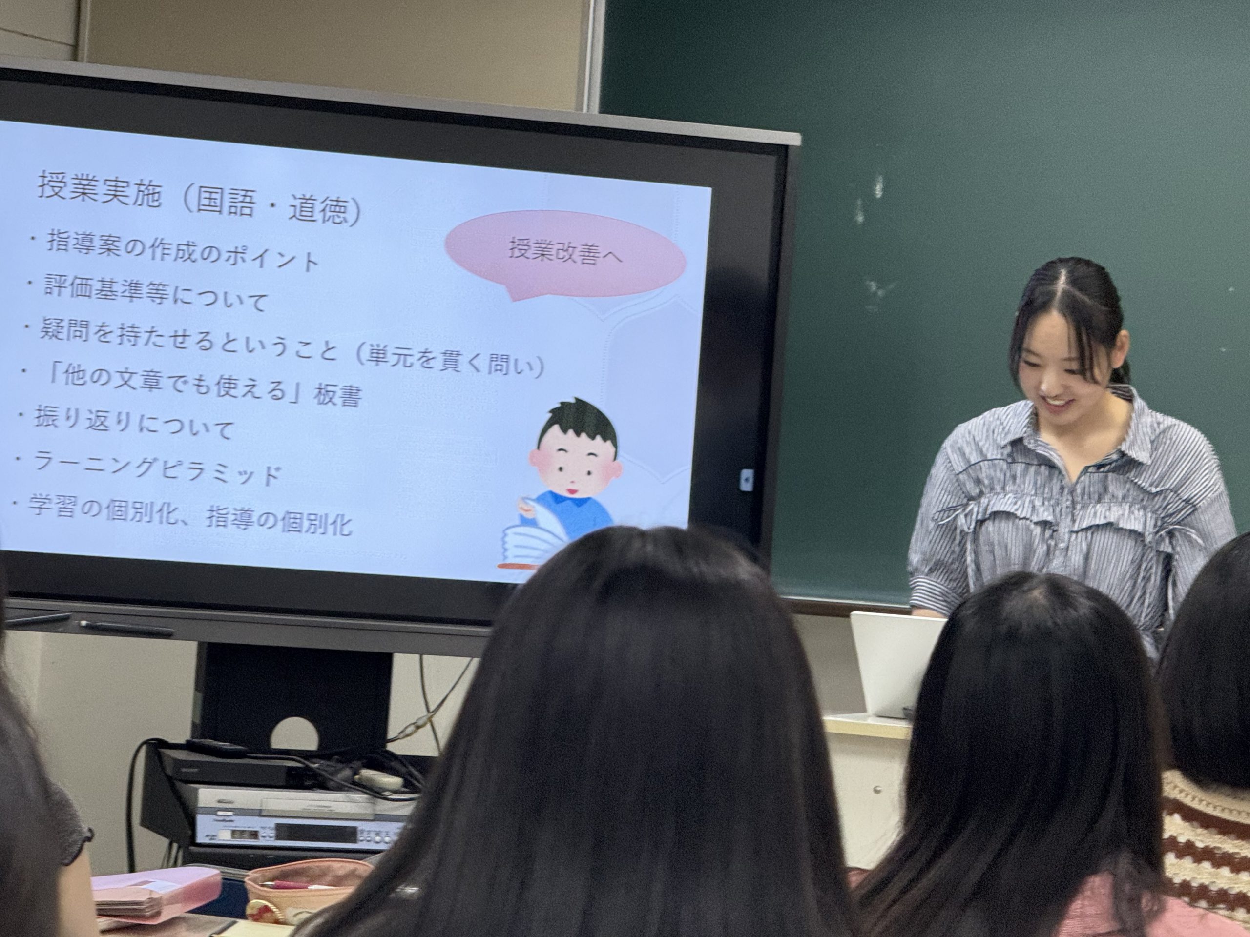 来年、教育実習を行う3年生からは「事前に教育実習で気を付けるべき点を知ることができて、よかった。」「プリントの文字の大きさなど細かい点にも配慮しなければならないことを改めて認識した。」「生徒との関わり方がとても大切だとわかった。心配だけど、来年の教育実習が楽しみになった。」といった声が聞かれました。