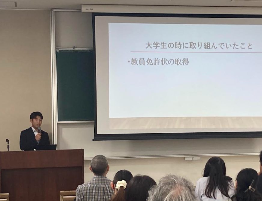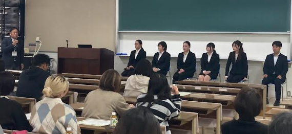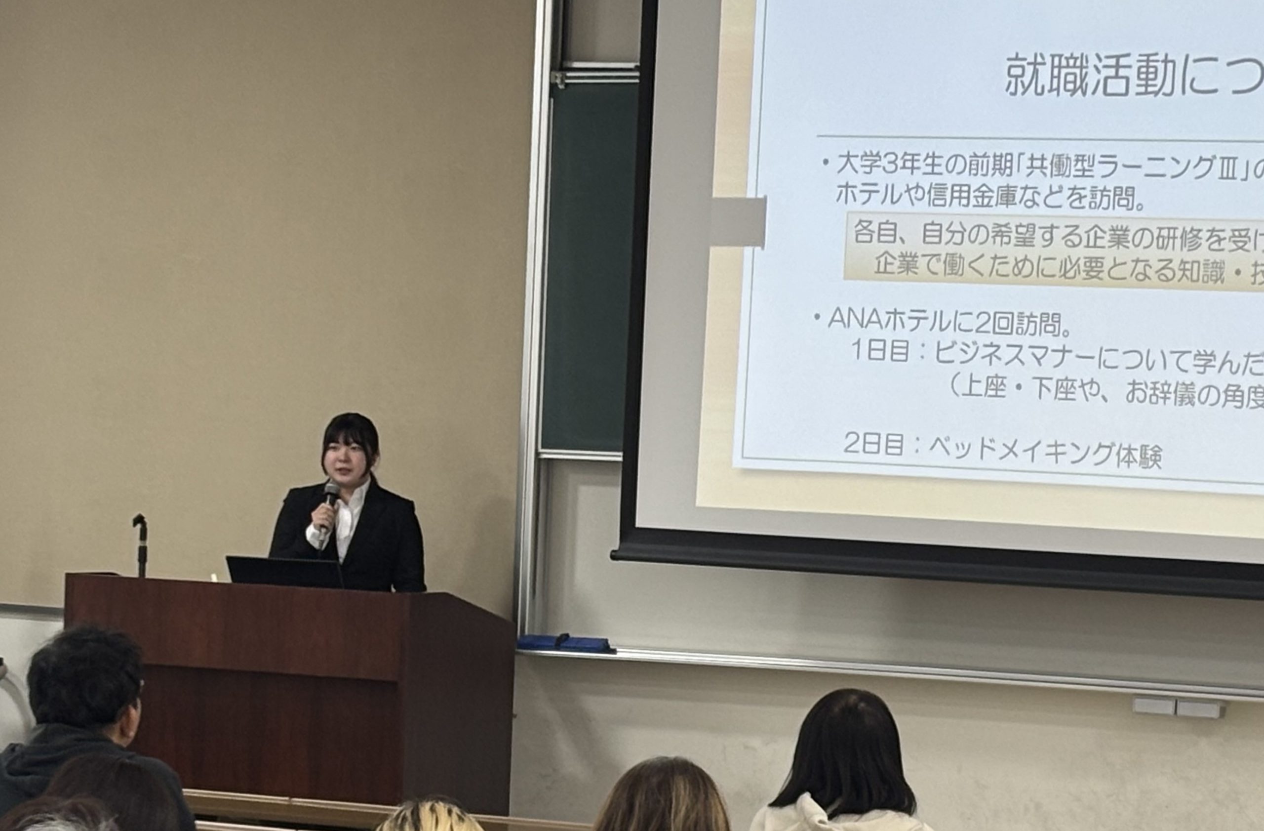 総合人間学部の懇談会では、4年生の就職内定者及び卒業生に来てもらい、内定獲得までのプロセスや在学生向けた就活アドバイス等を楽しく、そして分かりやすくプレゼンしてもらいました。発表者の業種は、ホテル業界、不動産業界、学校教員など様々で、業種ごと就活ポイントの違いなども知ることができました。