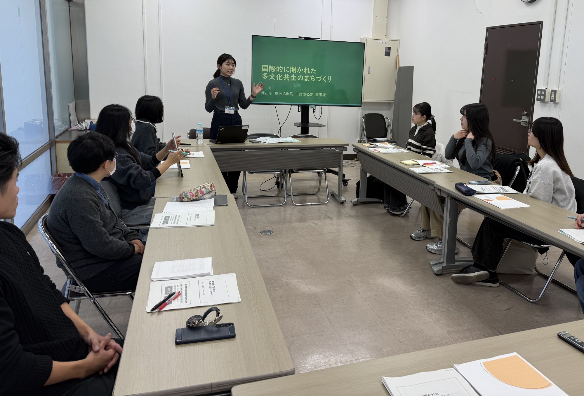 12月12日、言語文化学科3年の山田ゼミ(日本語教育)の学生が岡山市役所を訪れ、国際課の金子さんに「国際的に開かれた多文化共生のまちづくり」というテーマでお話を伺いました。岡山市の在留外国人は令和7年3月末時点で16,000人を超えています。そのような状況において、岡山市が行っている「タブレット端末を使った16言語対応のテレビ通訳」、「岡山市日本語教室」、「災害時多言語支援センター」など様々な在留外国人支援の施策を紹介していただきました。庁内の岡山市外国人総合相談窓口も見学させていただき、窓口対応をされている職員の方のお話も聞くことができました。