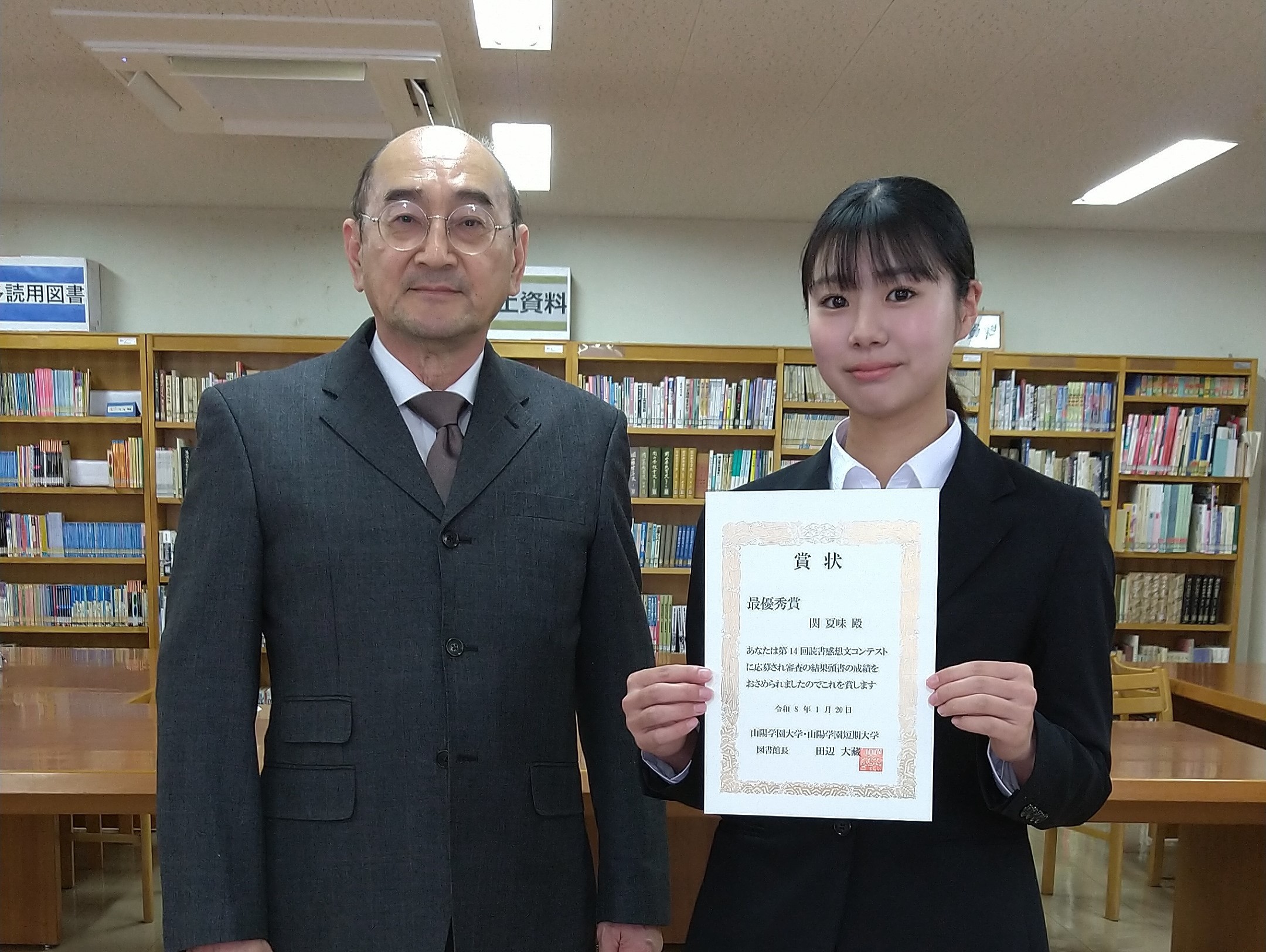 1月20日(火)には本学図書館で表彰式が行われ、田辺大藏図書館長から関さんに賞状と図書カード、副賞が贈られました。穏やかな雰囲気の中にも、真摯に読書と向き合った努力をたたえる心温まる式となりました。
