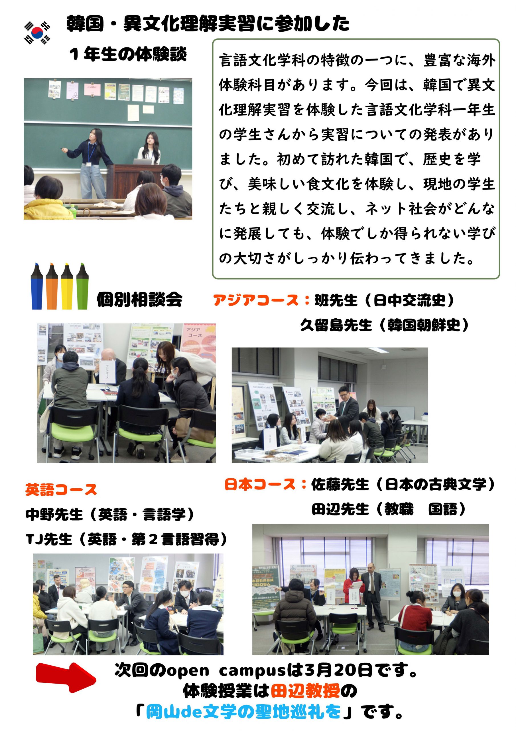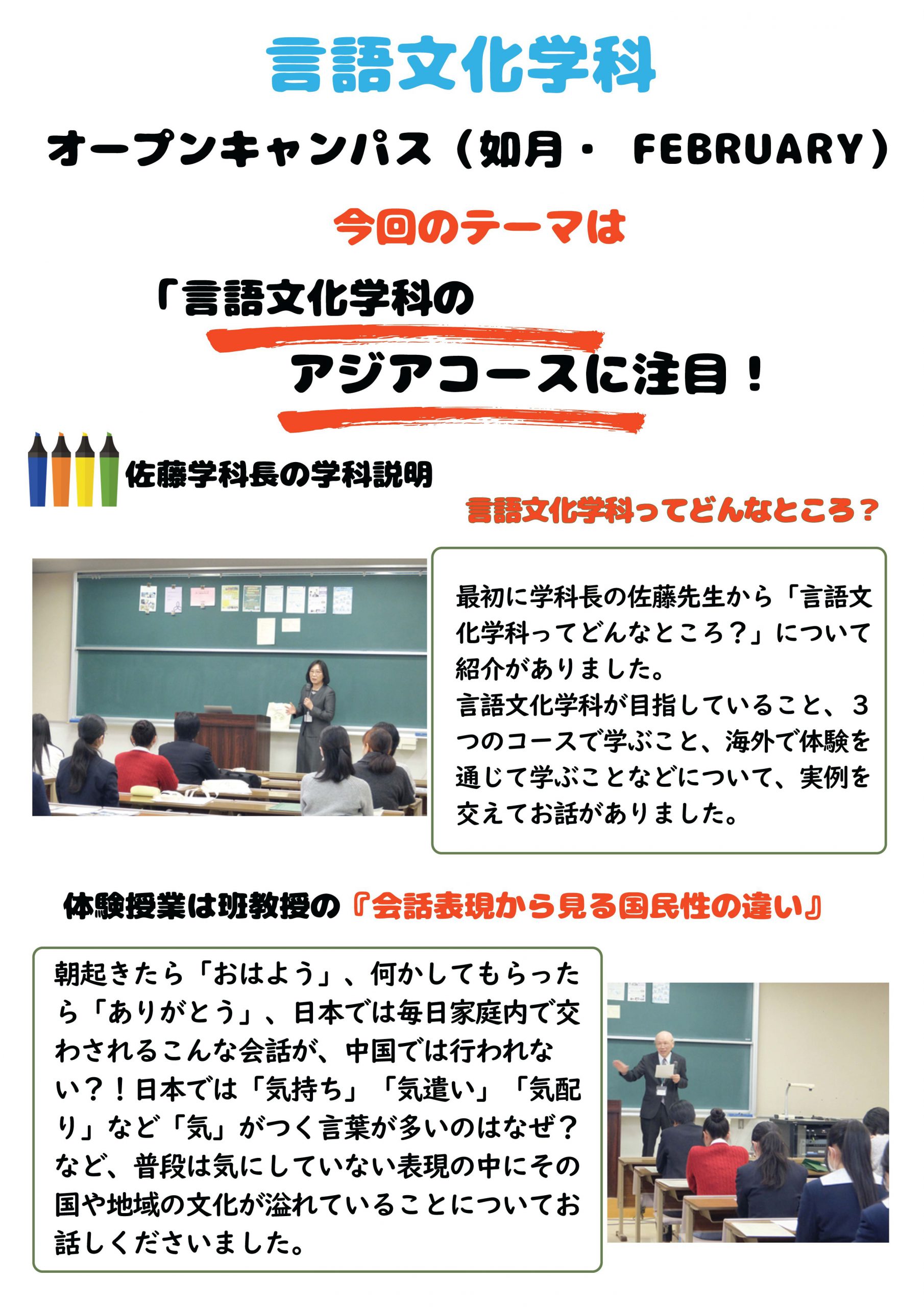 毎年、平日に行っていた2月のOCが今年から土曜日開催となり、より多くの皆さんに参加していただけるようになりました。今回は1年生から3年生まで、幅広い学年の生徒さんの参加がありました。 今後もオープンキャンパスは3月から8月まで毎月1回行われます。体験授業や学生さんの発表内容は毎回変わりますので、これから参加しようと思っている方はもちろん、今回ご参加くださった方も是非次回もご参加ください。