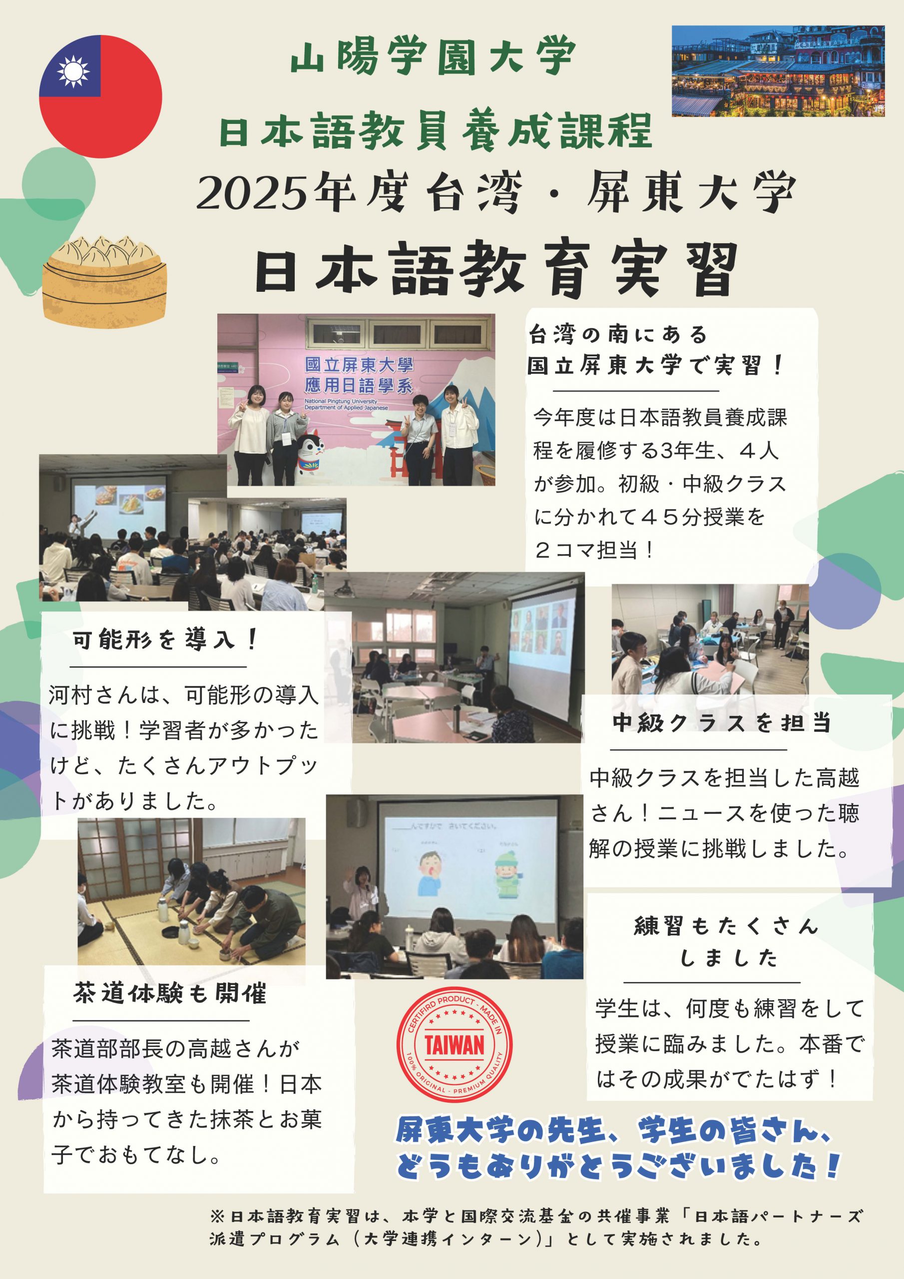 2026年3月2日から10日まで台湾を訪れ、国立屏東大学で日本語教育実習を行いました。屏東大学は3日から5日までの3日間お世話になり、その間に日本語の授業見学、教壇実習、文化交流として茶道体験教室も開催しました。6日は、台湾で日本語のバイリンガル教育を行う千葉幼稚園を見学しかわいい日本語学習者と交流しました。その後、台北に移動し、故宮博物館など見学。台湾の歴史を学びました。もちろん、小籠包、タピオカ、果物など台湾フードも楽しみました。