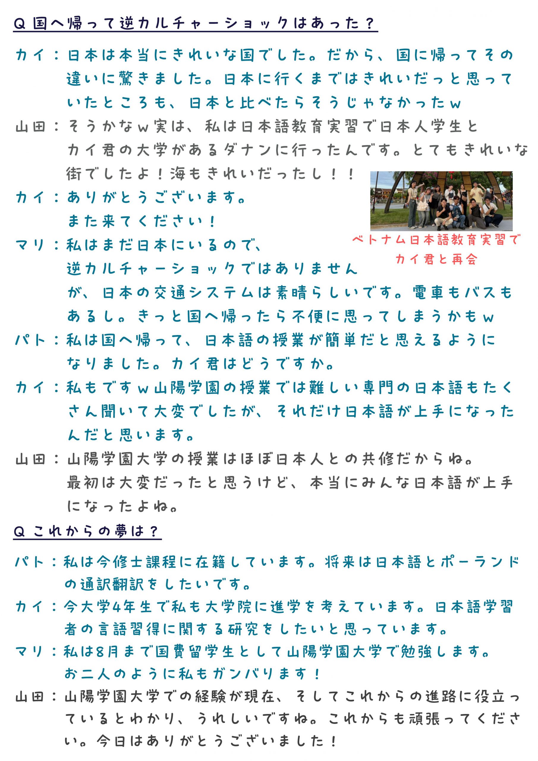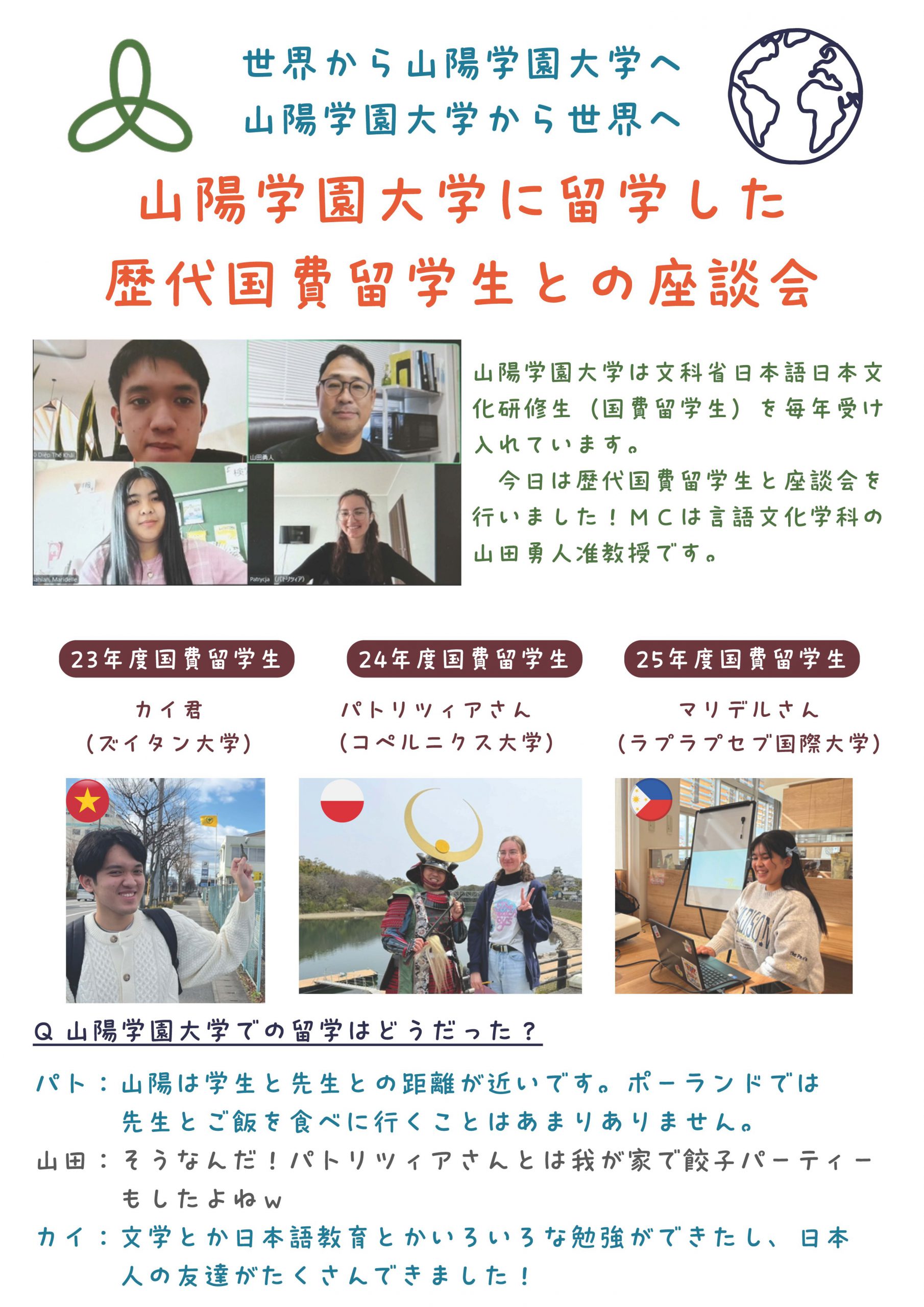 山陽学園大学言語文化学科では毎年、文科省日本語日本文化研修生(国費留学生)を受け入れています。今回、zoomでベトナム、ポーランドそして日本を結び、本学に留学した歴代国費留学生との座談会を行いました。山陽学園大学での思い出や現在の様子などを聞くことができました。