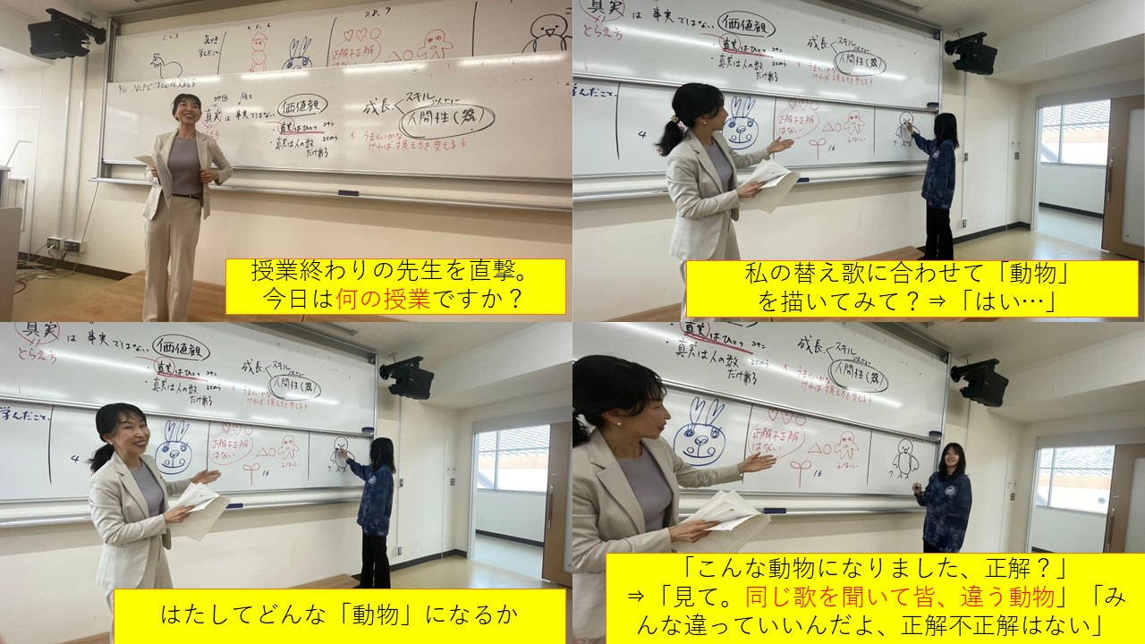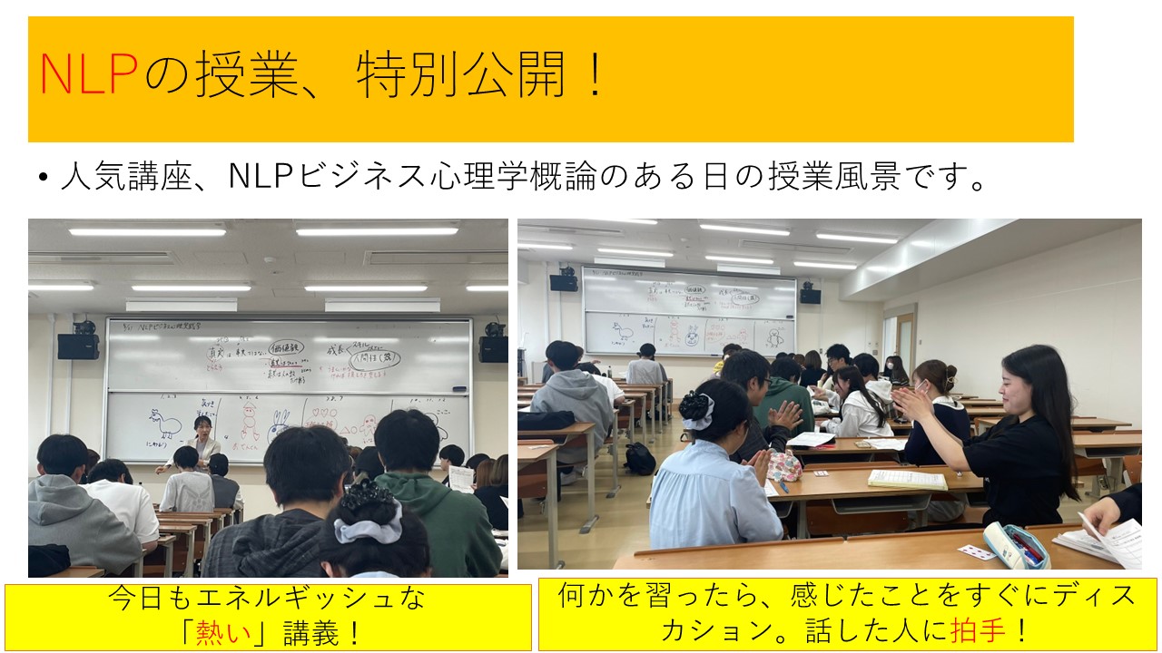 NLPビジネス心理学概論という人気授業についてご紹介します。 とてもエネルギッシュな先生にみんな圧倒?先生によると感情は伝染するそうで、確かにこの授業を受けると一日、ハイテンションになります。考え方を変える、つまり頭の回路を切り替えるだけで人生が大きく変わる。それを実践で学んでいきます。 通常は一線で働くビジネスパーソンが受講している講義を受講できているので、学生にとってとてもいい経験になっています。今日もポジティブになれました!