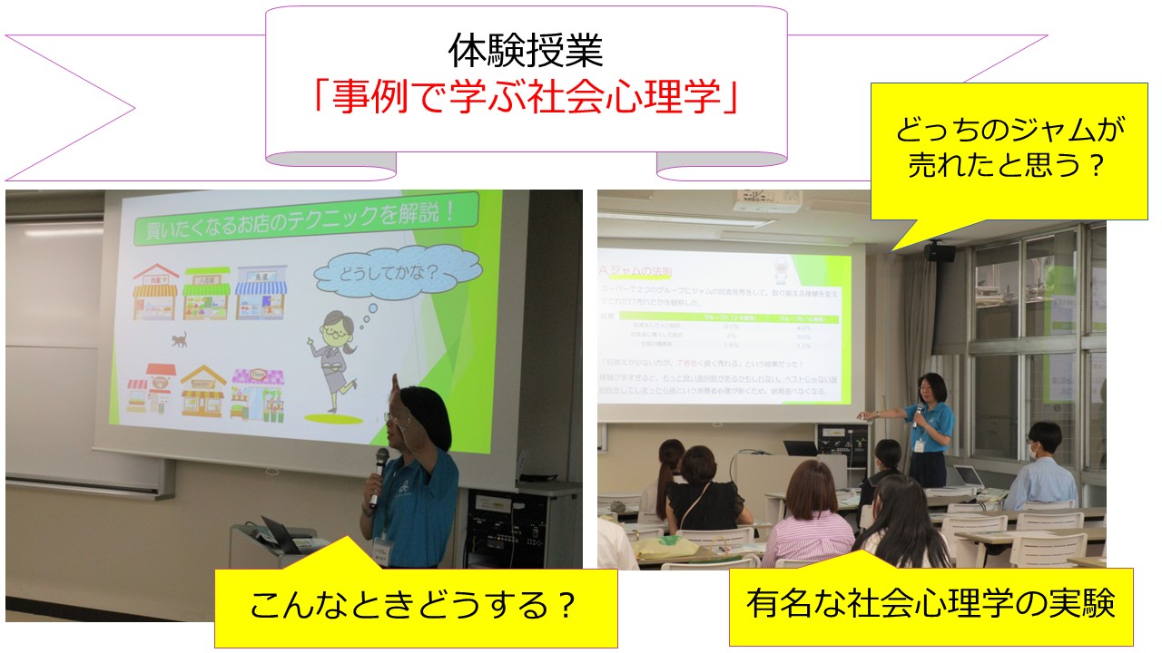 体験授業では、「事例で学ぶ社会心理学」という授業を行い、ビジネスで使われている社会心理学の例が多数紹介されました。有名なジャムの実験や、ちょっとした心理学の活用で、売上が大幅に増えたお弁当屋さんの話など、楽しく学ぶことができました。