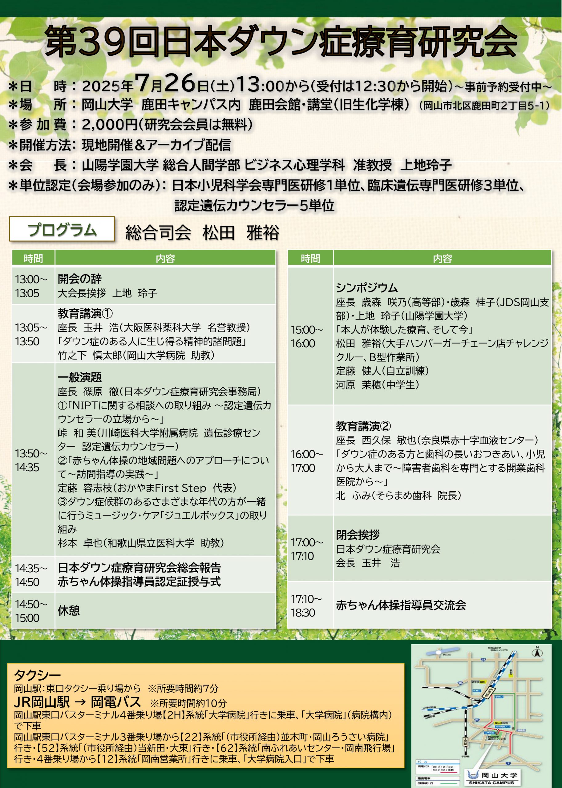 「第39回日本ダウン症療育研究会」が岡山大学で開催され、総合人間学部ビジネス心理学科の上地玲子准教授が会長を務めます。