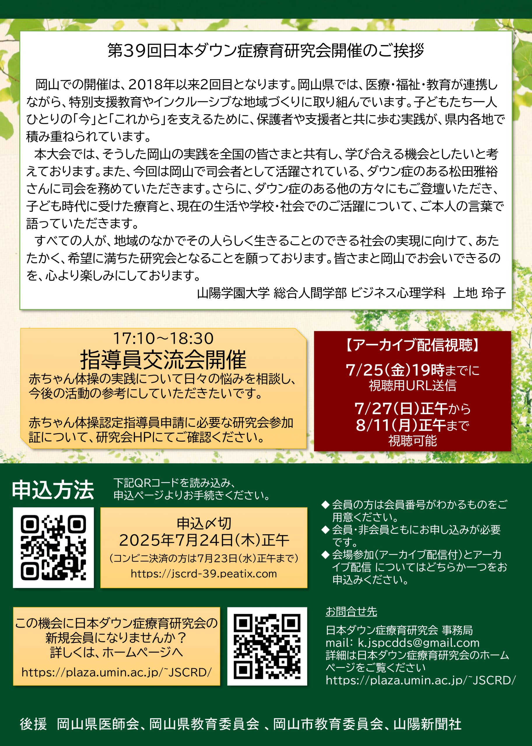 研究会の詳細については、以下のチラシ、または日本ダウン症療育研究会のホームページよりご確認ください。