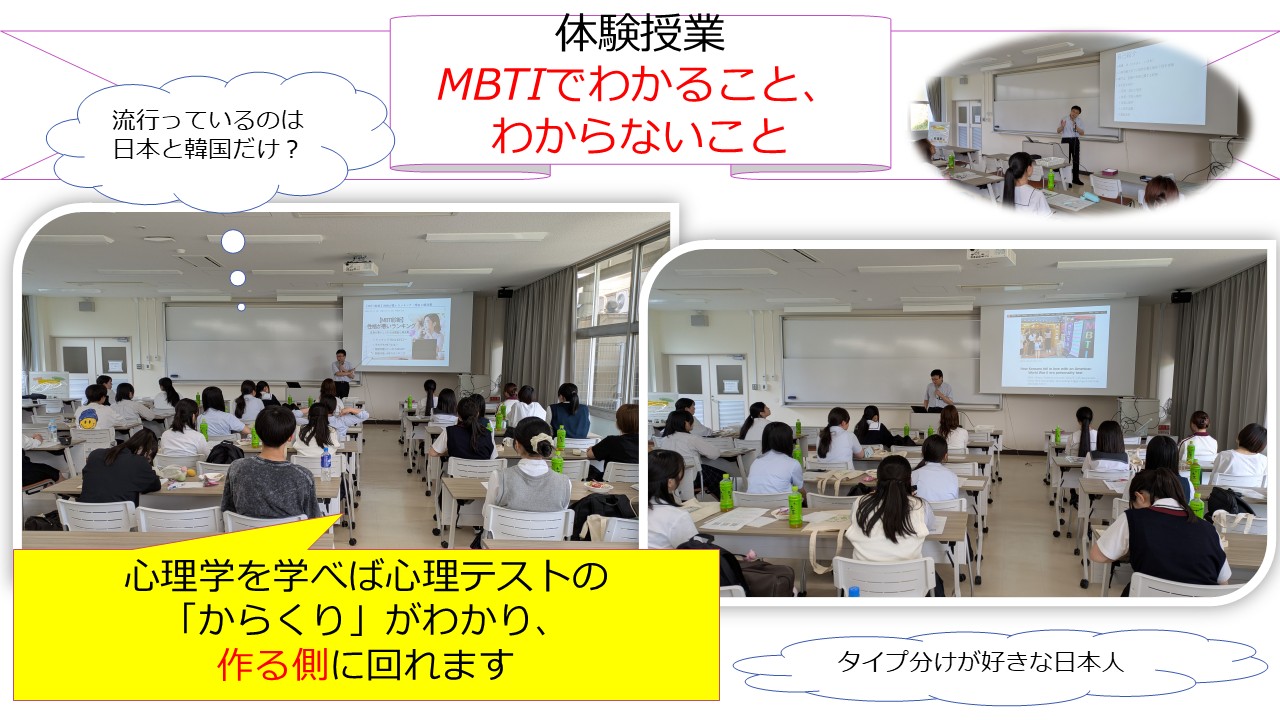 体験授業では、「MBTIでわかること、わからないこと」というタイトルで、髙橋准教授の授業がありました。流行りの心理テストであるMBTIを作る側から見ると、さまざまなからくりのようなものが見える、心理学を学ぶと心理テストを作る側に回れるというお話などがありました。また流行っているのは日本や韓国だけで、大昔に欧米で開発されたタイプ分けテストがなぜ流行っているのか、疑問の声が欧米では上がっていることなどの紹介がありました。高校生には身近な話題だったのではないでしょうか。