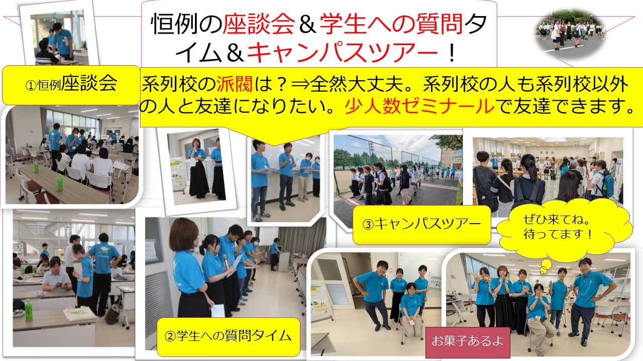 学生への質問コーナーでは「系列校の学生が派閥を作っているでは?」という質問に、「私は系列校ではないが、逆に系列校の人は系列校以外の人と友達になりたがっている。基礎演習という少人数ゼミナールもあり、すぐに友達ができるので、何の問題もない」と学生が回答していました。最後に全員でキャンパスツアーを行い、終了となりました。参加してくださった皆さん、ぜひまた来てくださることを願っています。次回は7月19日(土)に行いますので、多くの方のご参加を心よりお待ちしています!