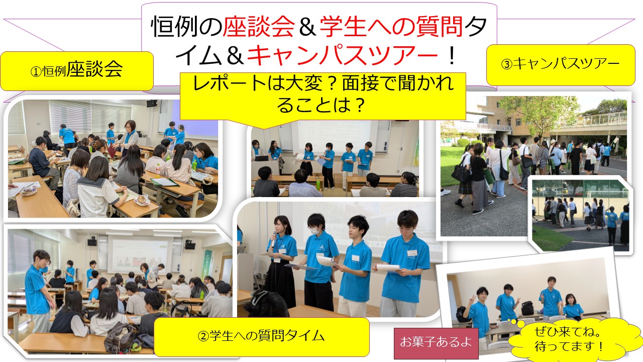 その後、お菓子を食べながらの恒例のフリートークでは多くの高校生や親御さんと話ができ大いに盛り上がりました。3年生の参加者からは「今度面接を受験するので、どんなことが聞かれるか知りたい」など受験に関する質問が多くありました。学生への質問コーナーのあと、キャンパスツアーを行って終了となりました。