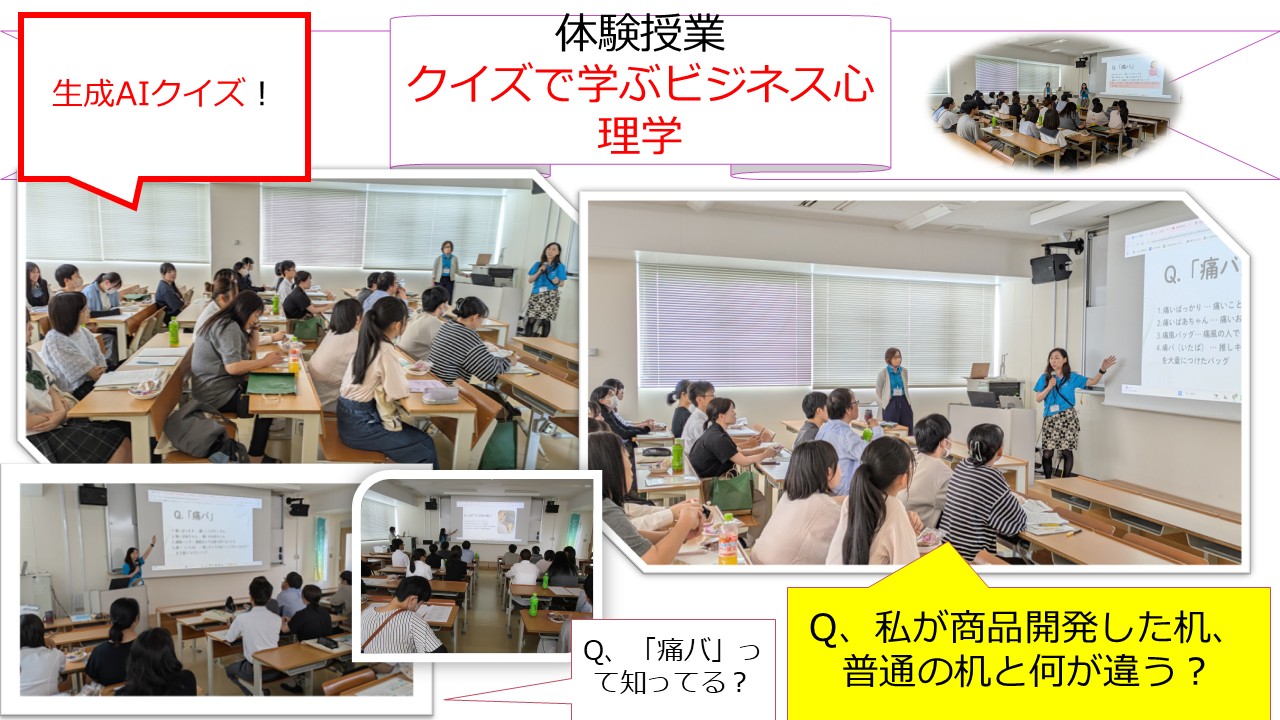 体験授業では、「クイズで学ぶビジネス心理学」として、クラブン株式会社さんで行った学生の最終プレゼンの様子がoniビジョンで放映されたのでその動画を見ました。その後、商品開発に心理学を活かして活躍されている上地准教授から開発した商品に関するクイズを出題しました。その後、国立情報学研究所で最先端の生成AIを研究され、全国で150人しかいない文部科学省の学校DX戦略アドバイザーの生成AI部門に抜擢され、デジタル庁のデジタル推進委員として、国のデジタル化、 DX化を推進する立場にある黒田准教授から、生成AIに関するクイズが出題されました。驚いたことにそのクイズの質問は生成AI自身が考えた質問だったことが最後に明かされました。参加の高校生の皆さんや親御さんは楽しそうにクイズに答えて下さいました。
