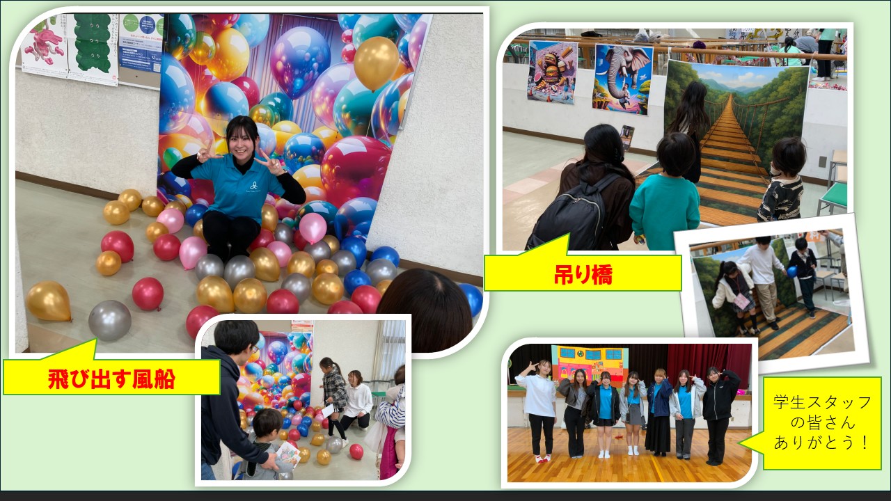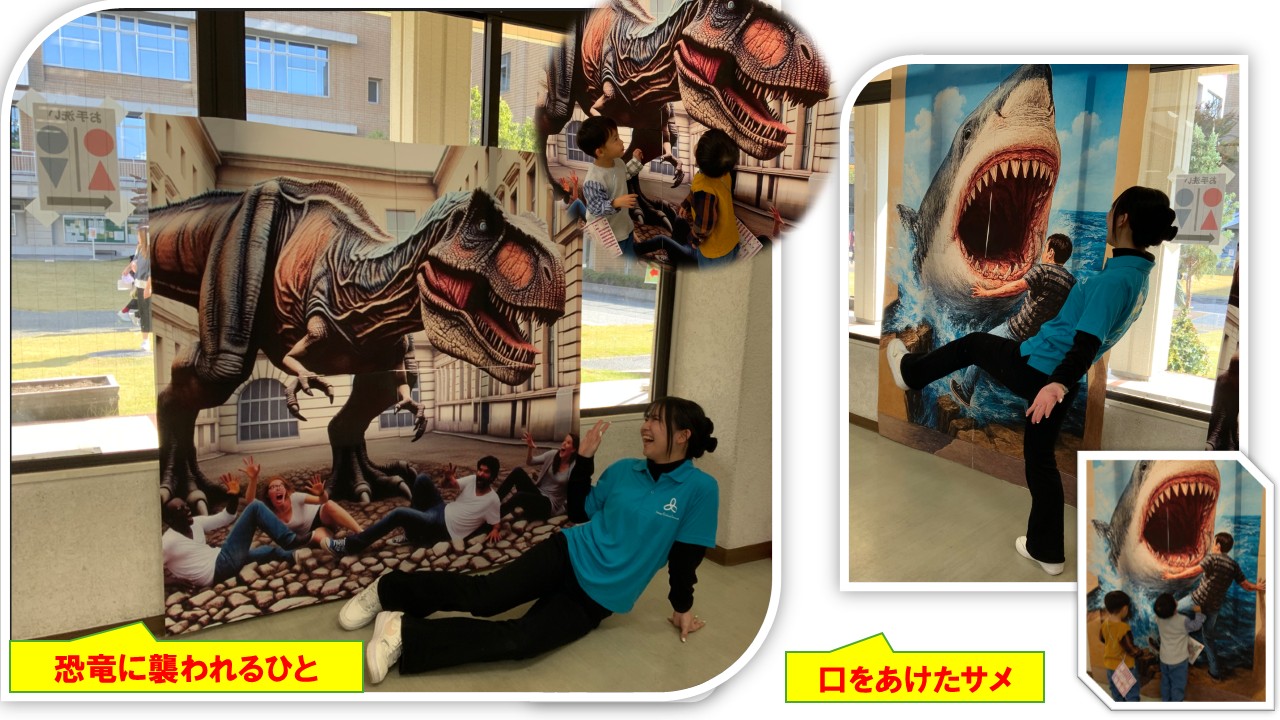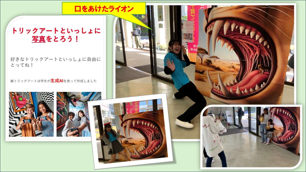 「トリックアートと一緒に写真をとろう!」という企画で、トリックアートは主に学生が「生成AI」を使って作成しました。窓側に「口を開けたライオン」「口を開けたサメ」「恐竜に襲われる人」の大型ポスターを貼りました。訪れた人は皆さん「すごい!」と言ってくださり、親子で楽しく写真を撮ってくださいました。壁側には「クレーンゲーム」「飛び出す風船」を貼り、飛び出す風船では風船ポスターの前に風船をたくさん配置し現実とつながっているような演出をしました。この風船がお子さんに大人気で、風船がなくなると風船が欲しいと泣き出すお子さんもいました。「穴が空いたように見えるトリックアート」や特に「吊り橋のトリックアート」が人気で、たくさん親子で写真を撮ってくださいました。