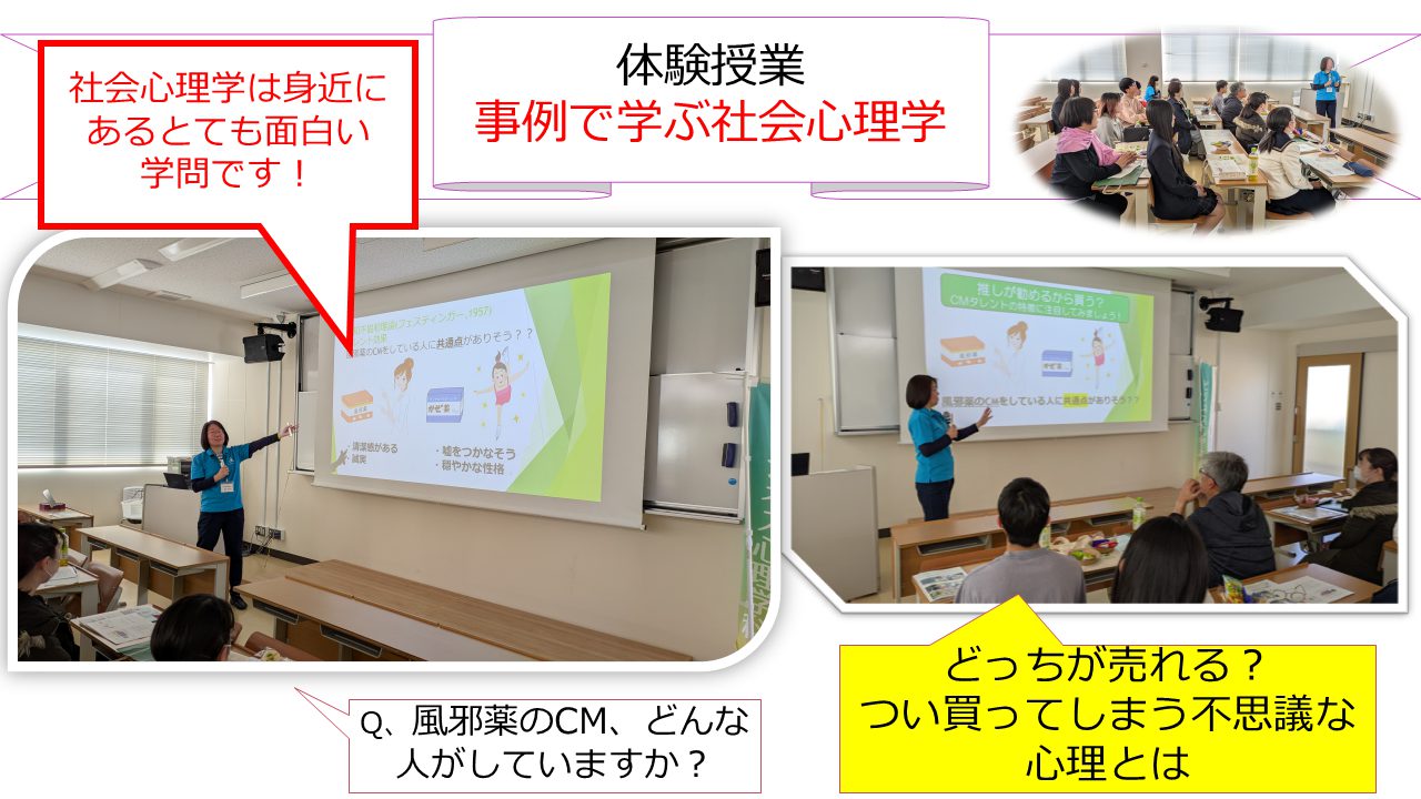 その後、「事例で学ぶ社会心理学」というタイトルで体験授業を行いました。現実の社会の中でどんな心理学が使われているか様々な事例から学ぶ授業で、普段目にしているCMに関する心理学の話や、普段の買い物行動にも様々な心理学の理論が関係していることなどが紹介され、参加者の方も身近な例として、大きくうなずいて聞いておられました。