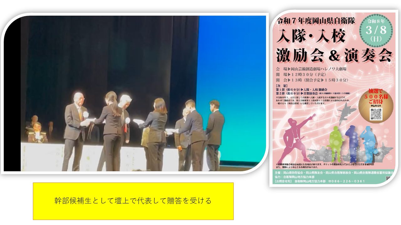 このような盛大な会を開いて頂き感謝致します。3月後半から、岡山を離れ、各地で訓練が始まっています。ぜひ日本を守るという素晴らしい職務の中で、心身ともに成長した姿でまた再会したいと思います。