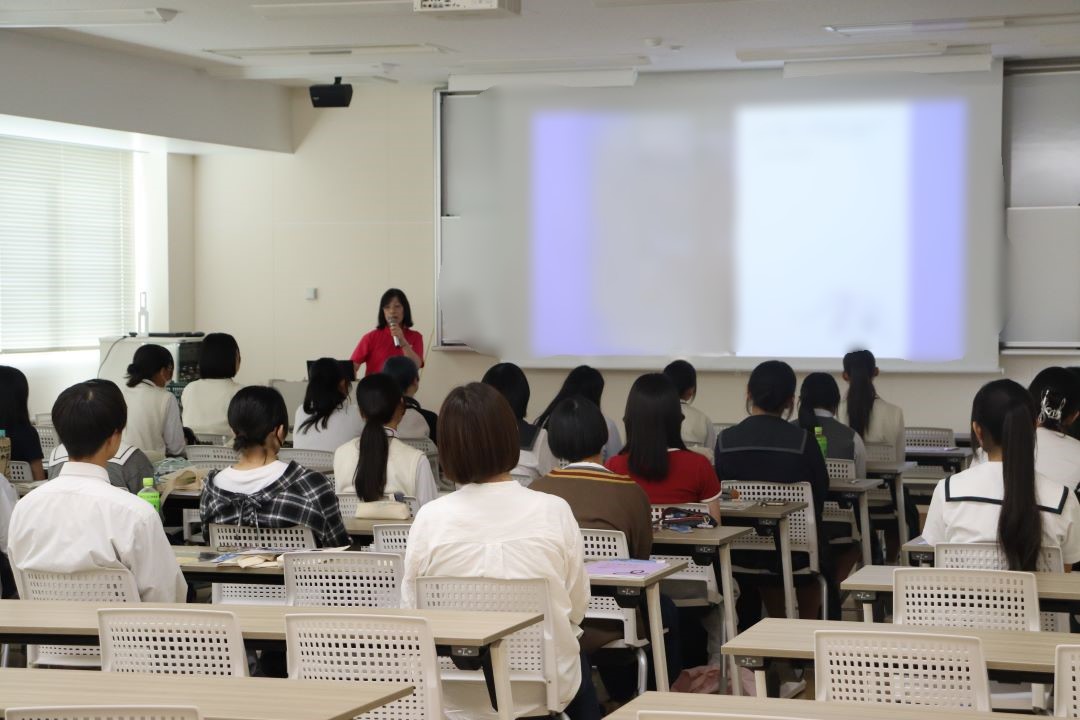 こども育成学科では、模擬授業『絵本で あ・い・う・え・お』を行いました。生徒の皆さんには、言葉あそびやクイズを通して、絵本の言葉と絵のおもしろさや工夫を学んでいただきました。後半は、かわいい子どもたちのいる幼稚園や学生が練習をしているピアノ室などの見学を行いました。学科説明では学科の楽しさをお伝えし、皆さん熱心に聞いてくださいました。