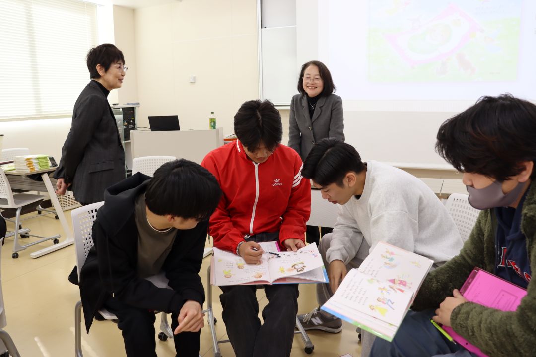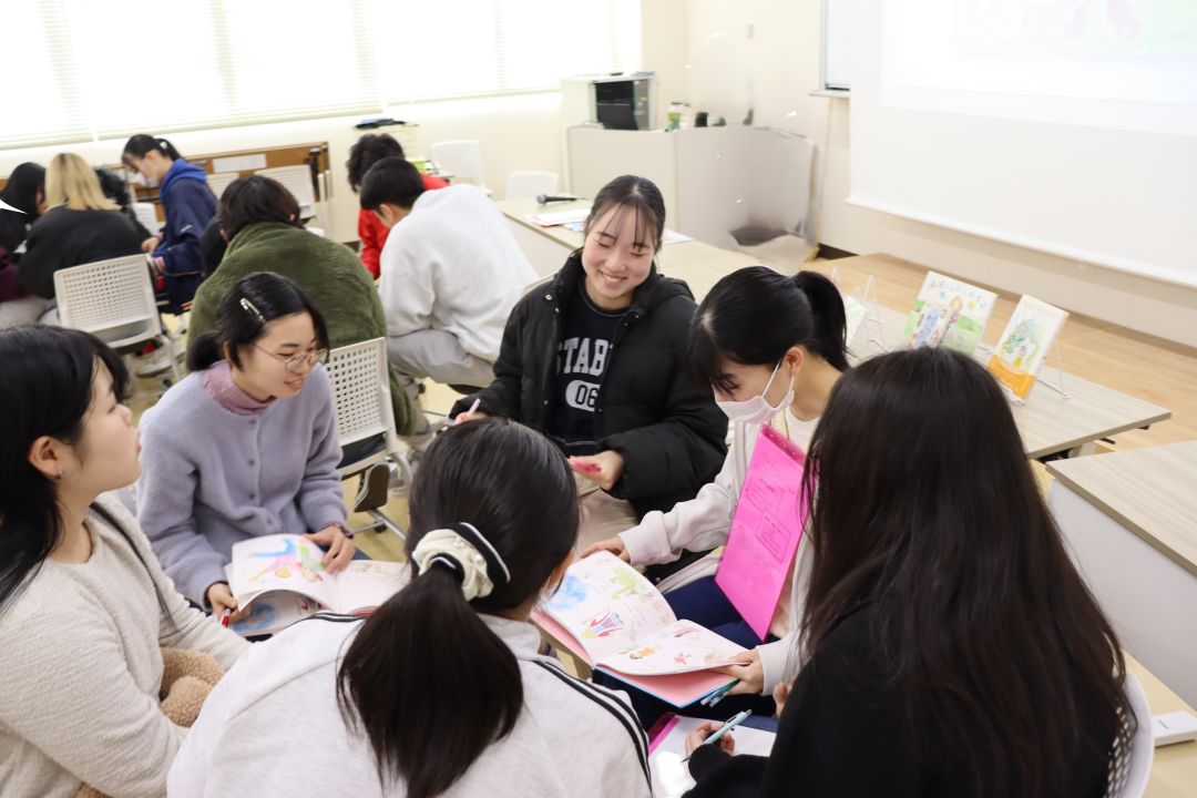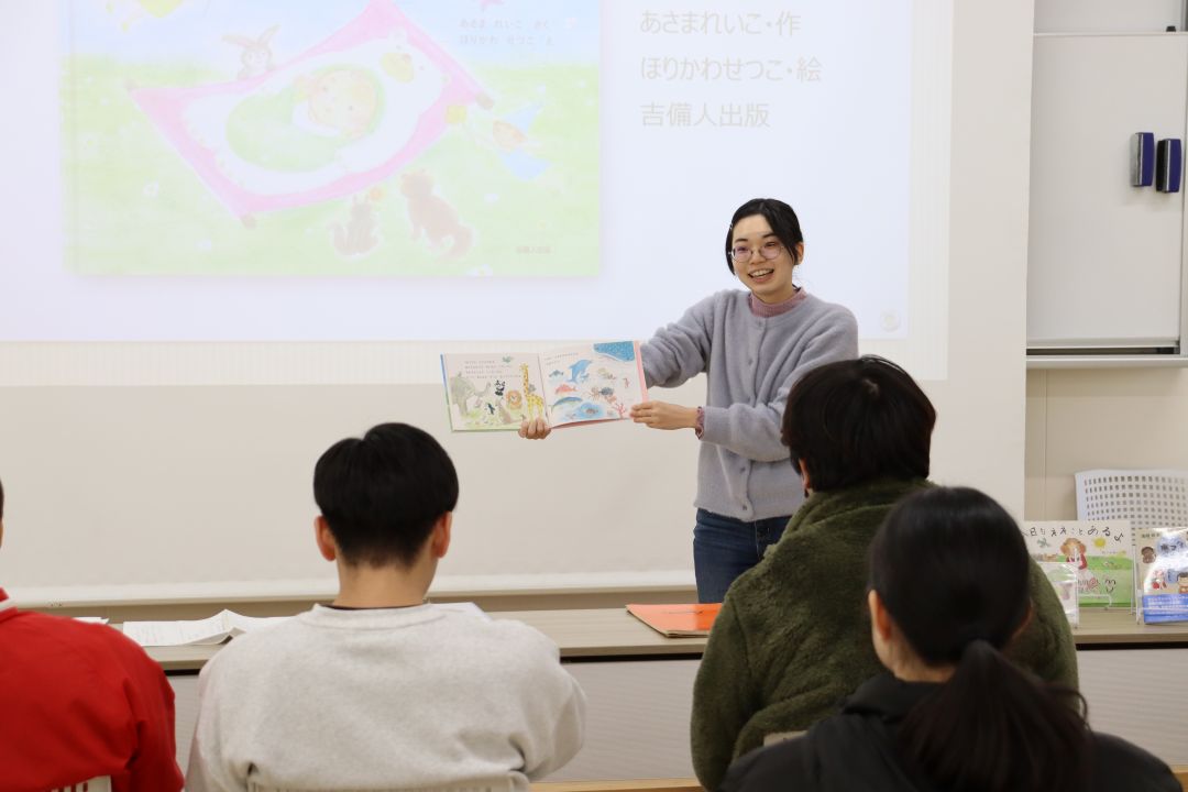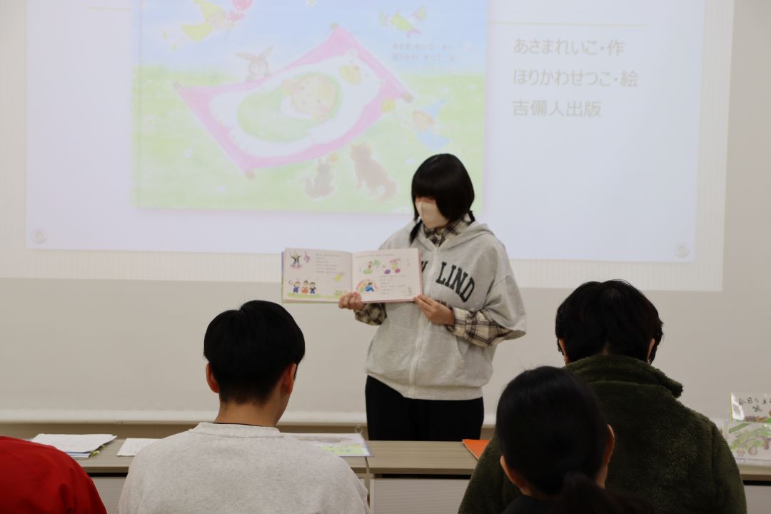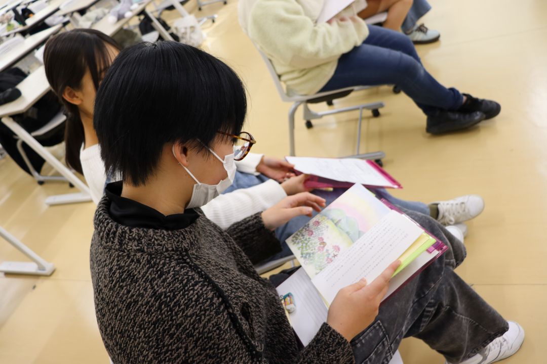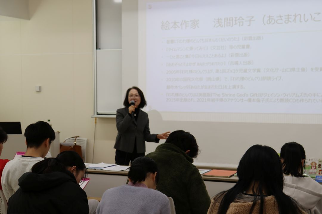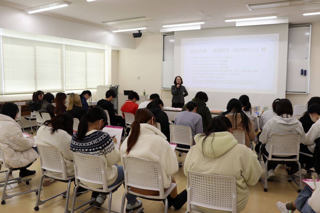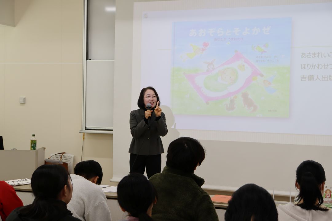 第1回ズッコケ児童文学賞を受賞した浅間玲子様にゲストスピーカーとして来ていただきました。絵本作家になろうと思った理由や絵本作家の仕事の魅力について話をしていただきました。学生は絵本『あおぞらとそよかぜーあなたがうまれたひ』(あさまれいこ さく・ほりかわせつこ え)のエピソードやメッセージを聞き、絵本の奥深さを学びました。
