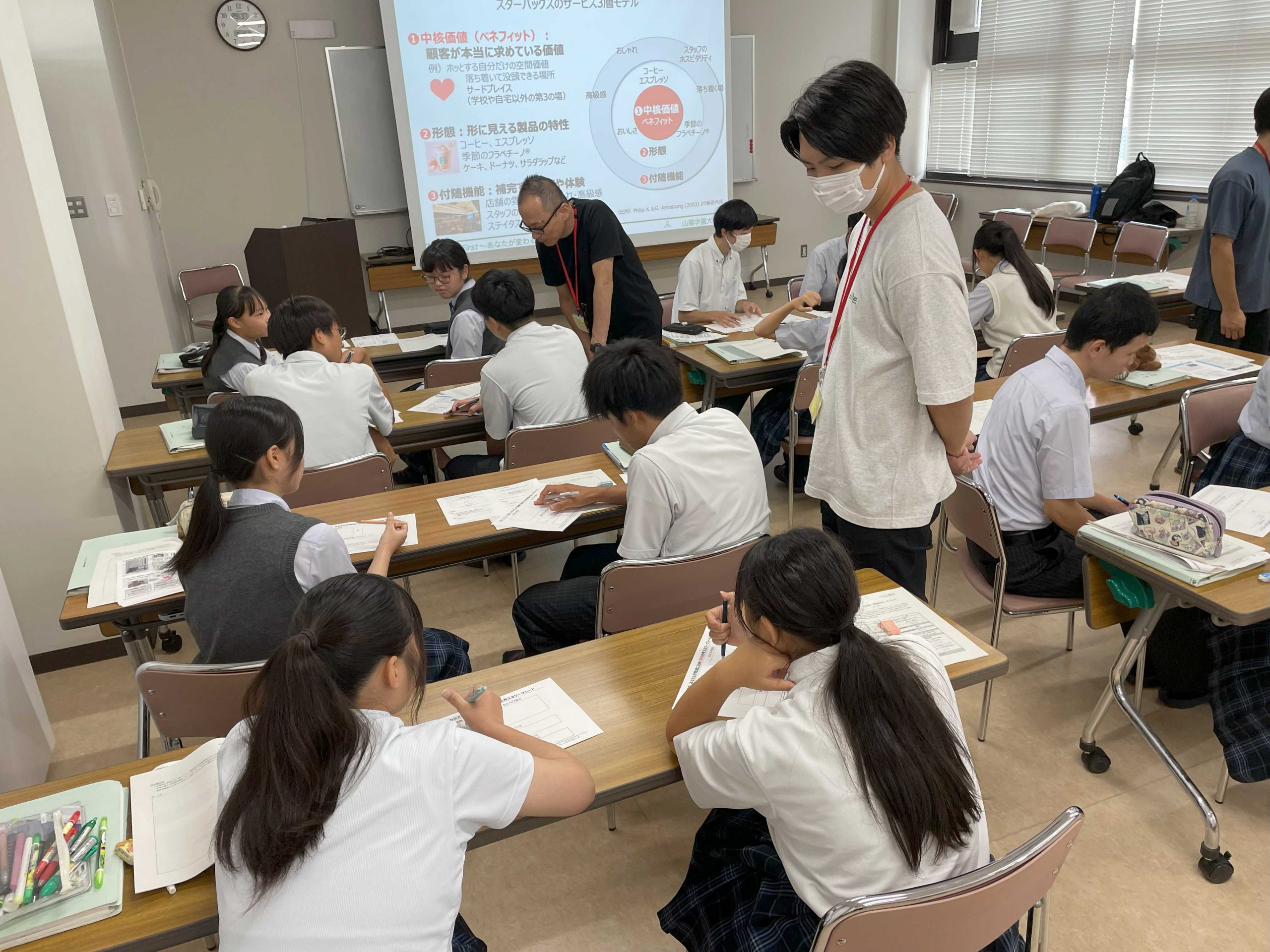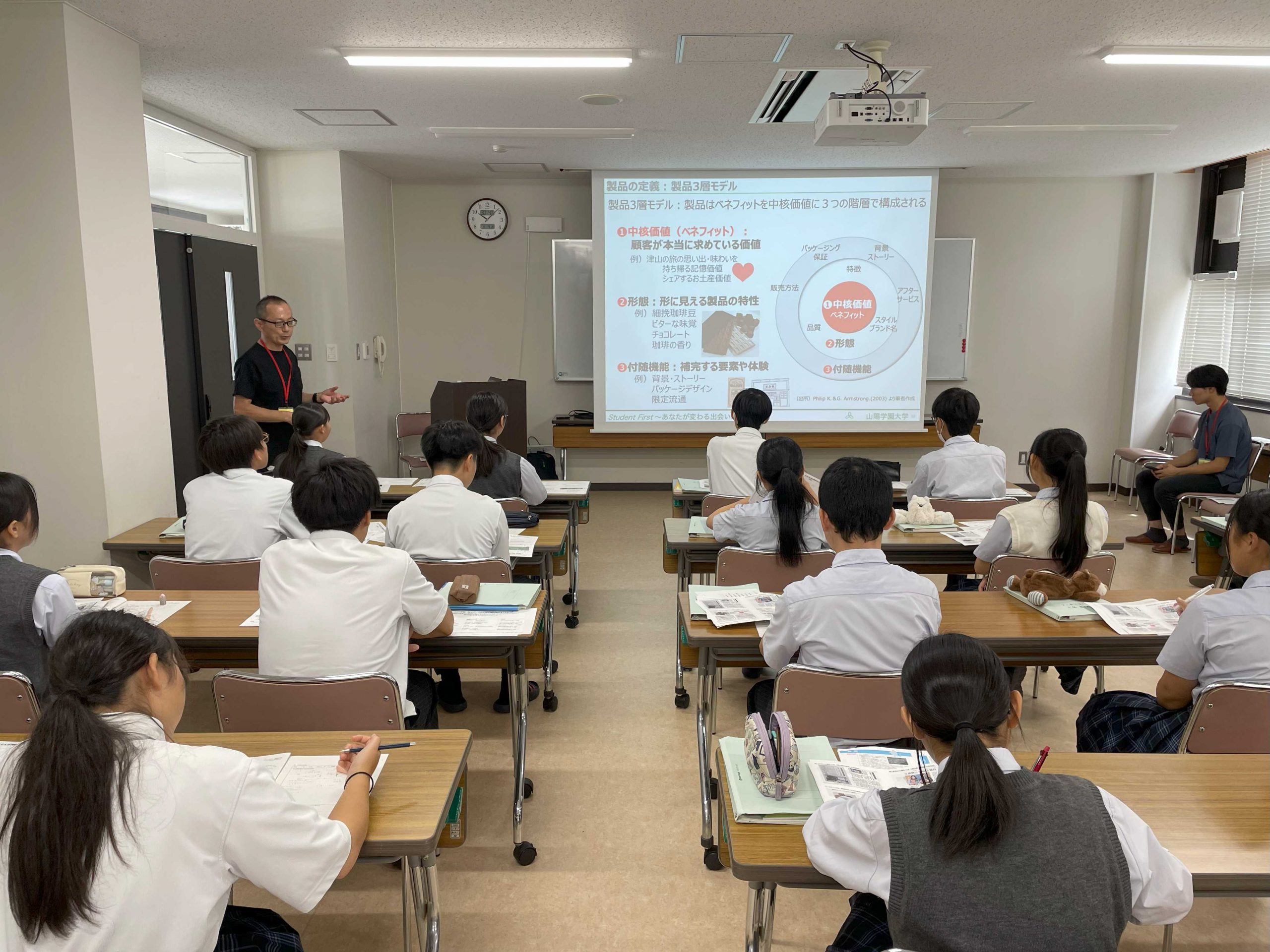 ゼミ生が、津山でのフィールドワークを行って開発した「津山珈琲チョコレート」の開発事例や、カフェの「便益」を考えるワークに取り組みながら、理解を深めていただきました。瀬戸南高校の卒業生2人を含めた地域マネジメント学部の学生も3人、アシスタントとして参加し、高校生と楽しい学びの時間を過ごしました。
