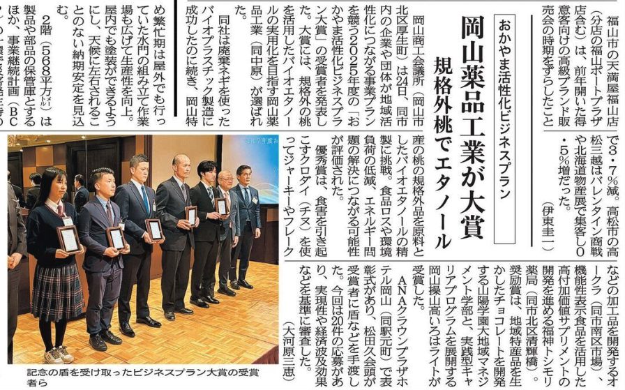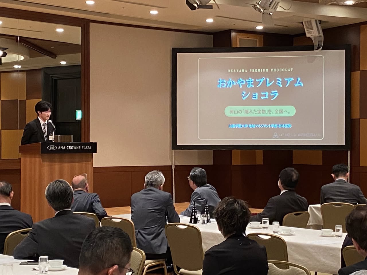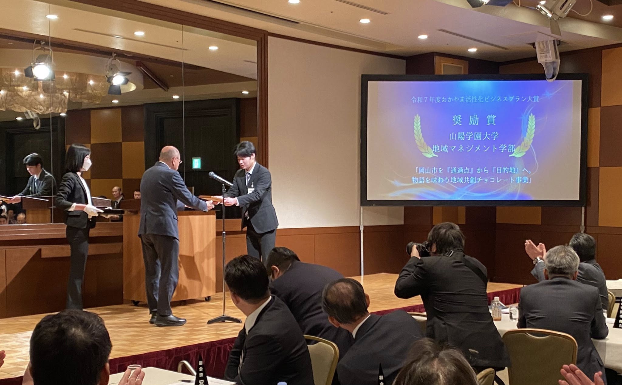 地域の活性化を目指す事業プランのコンテスト(主催:岡山商工会議所)の表彰式が3月24日(火)ANAクラウンプラザホテル岡山で開催されました。 ゼミ活動で開発した地域ごとの特産品を活かしたご当地チョコレート「おかやまプレミアムショコラ」を、よりビジネスとして展開する企画を独自に拡張させ、提案した地域マネジメント学部の3年生の杉本拓弥さんが奨励賞を受賞しました。ご聴講いただいた100人以上の岡山商工会議所議員の前で自分のビジネスモデルを発表し、さまざまな企業様からご関心をいただきました。 地域マネジメント学部では、このようなコンテストにも学生が自ら主体的に参加しています。自由に描いて、自分の企画をマーケットに評価してもらう。本学部では、学びを学内に収めず、実社会との連携までを重視しています。 なお、表彰式の様子は翌日の山陽新聞地方経済面で掲載されました。