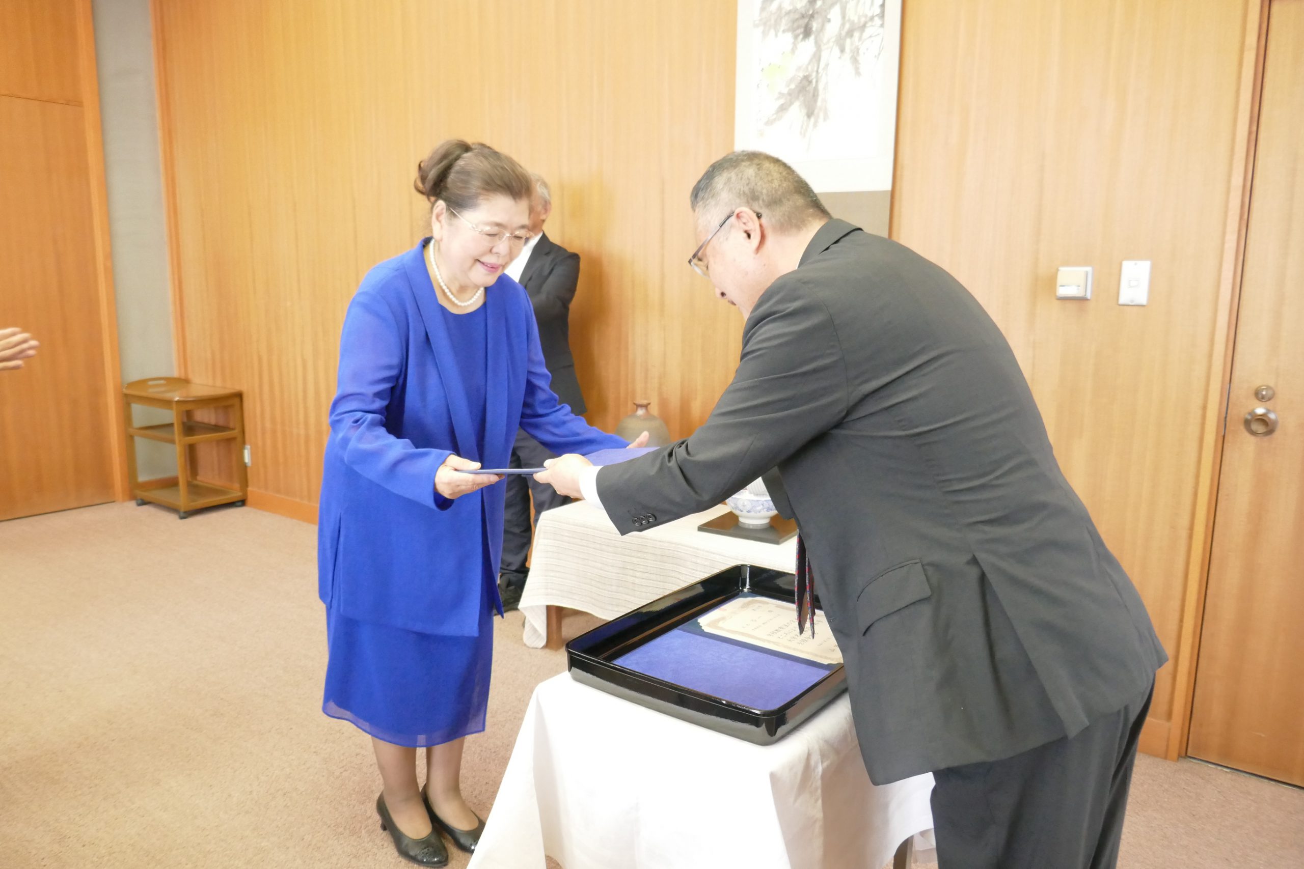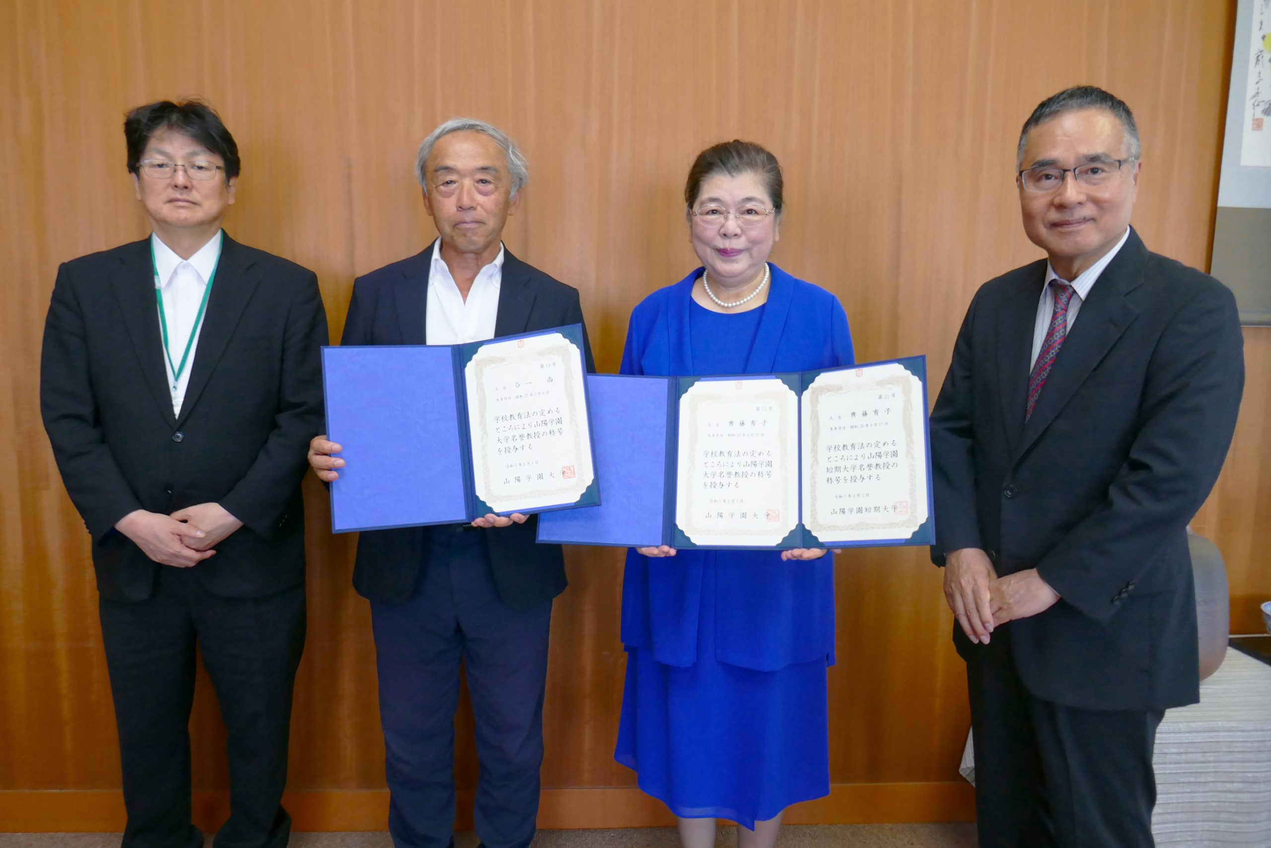 齊藤育子前学長、及び、谷一尚特任教授の名誉教授授与式が学長室で執り行われました。 齊藤前学長に山陽学園大学・短期大学の名誉教授の称号が、谷一特任教授に山陽学園大学の名誉教授の称号がそれぞれ授与され、毛利学長より、両先生方の長年にわたる教育と研究への貢献に感謝と敬意が表されました。 授与式の後は、毛利学長、櫻井副学長を交え、山陽学園大学・短期大学のさらなる発展への期待を語る和やかな語らいのひとときとなりました。
