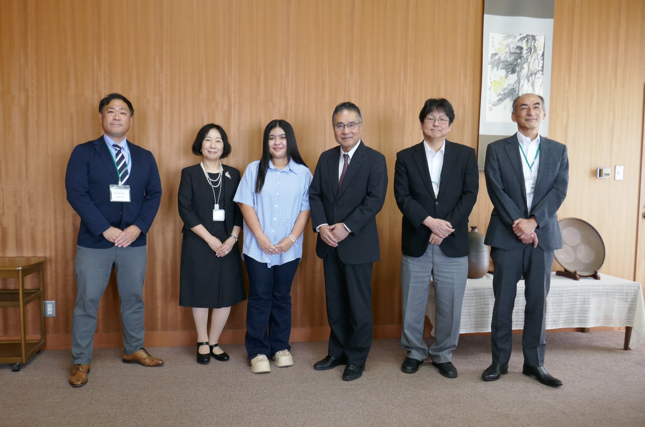 マリデルさんは学長室を訪問し、毛利学長、櫻井副学長(総合人間学部長)、佐藤共生・グローバル推進センター長(言語文化学科学科長)、担当教員の山田准教授らから歓迎を受けました。