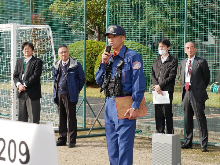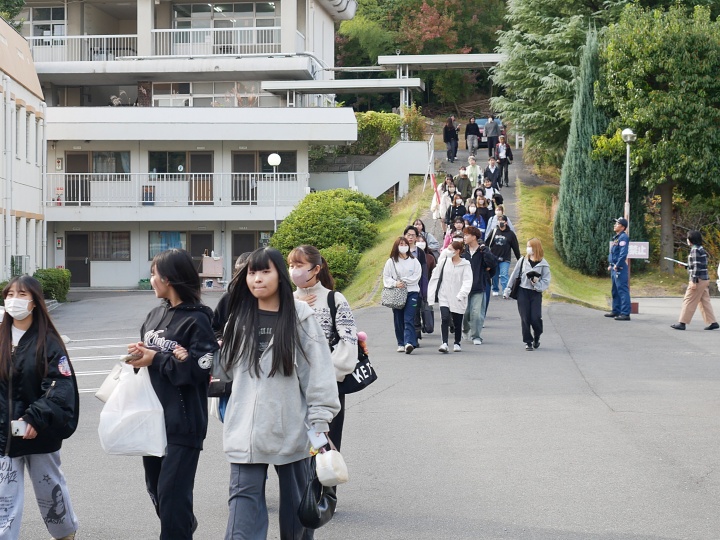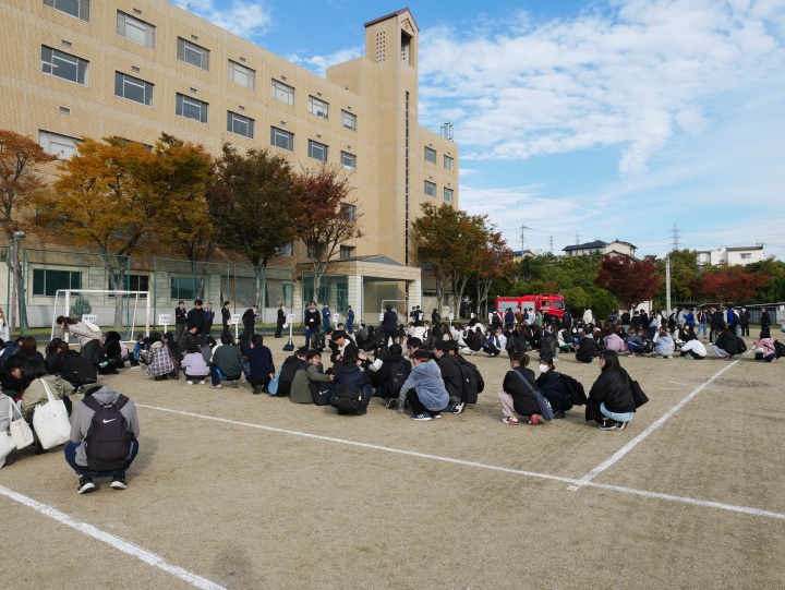 11月12日(火)、避難訓練を行いました。今回は、震度6の地震発生後、学生ホール厨房で火災が発生した場合を想定して実施しました。 訓練では、学内で災害発生を知らせる放送が流れ、学生は教職員の誘導に従ってグラウンドに避難しました。避難完了後、中消防署倉田出張所の隊員の方からの講評と講話があり、避難時における留意点等の説明を受けました。