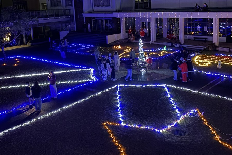 クライマックスにイルミネーション点灯式を行い、クリスマスツリーや光のシャワーなどが飾られ、学生たちは記念撮影をして楽しみました。