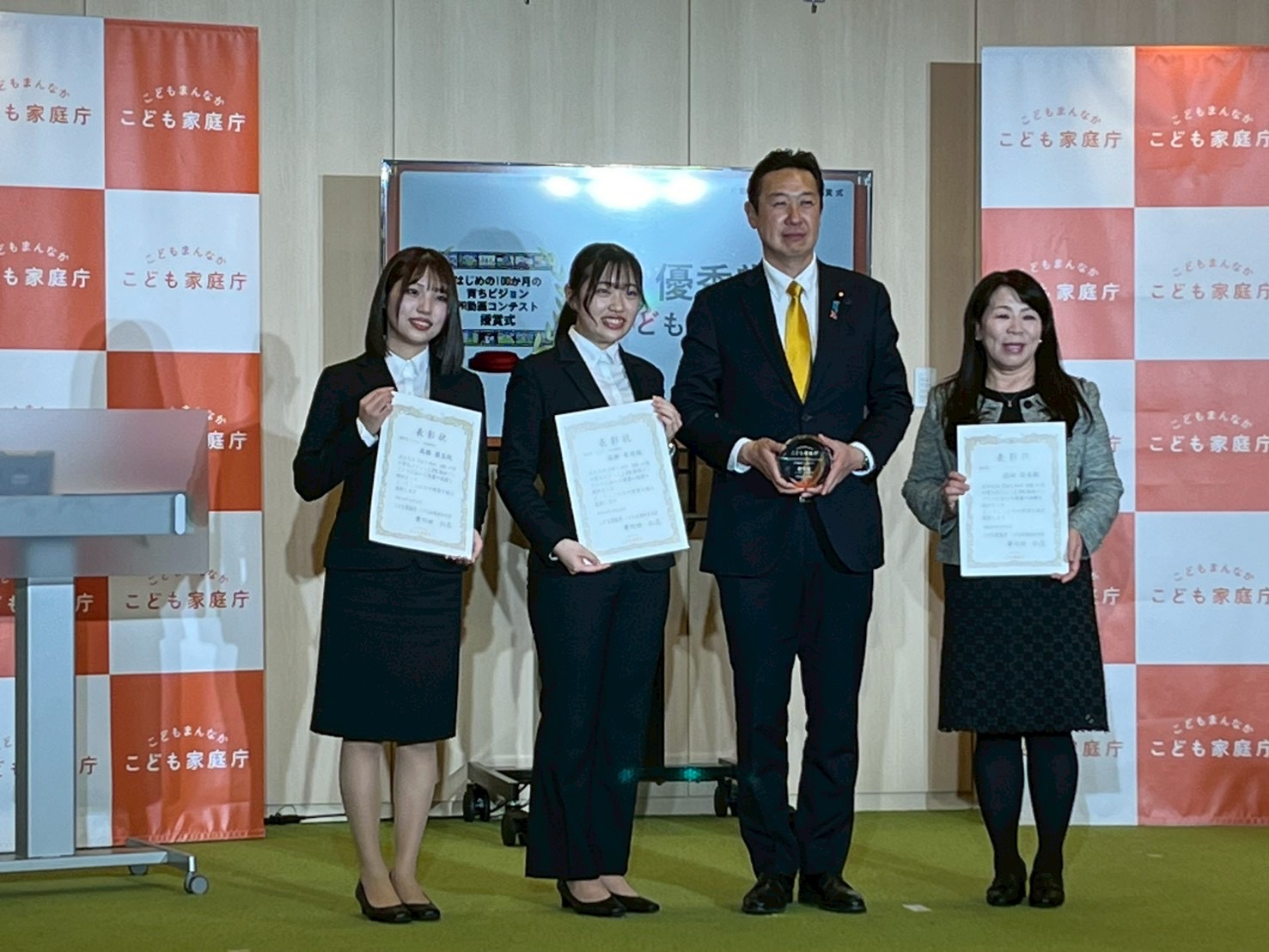 こども家庭庁が主催する「はじめの100か月の育ちビジョン PR動画コンテスト」において、こども育成学科3年の髙橋優菜さん、高柳琴珠さん、前田信美准教授が制作した動画作品『思いやりの芽』が「優秀賞」を受賞しました。これを受け、3月8日(日)に同庁にて執り行われた授賞式に3名が出席しました。